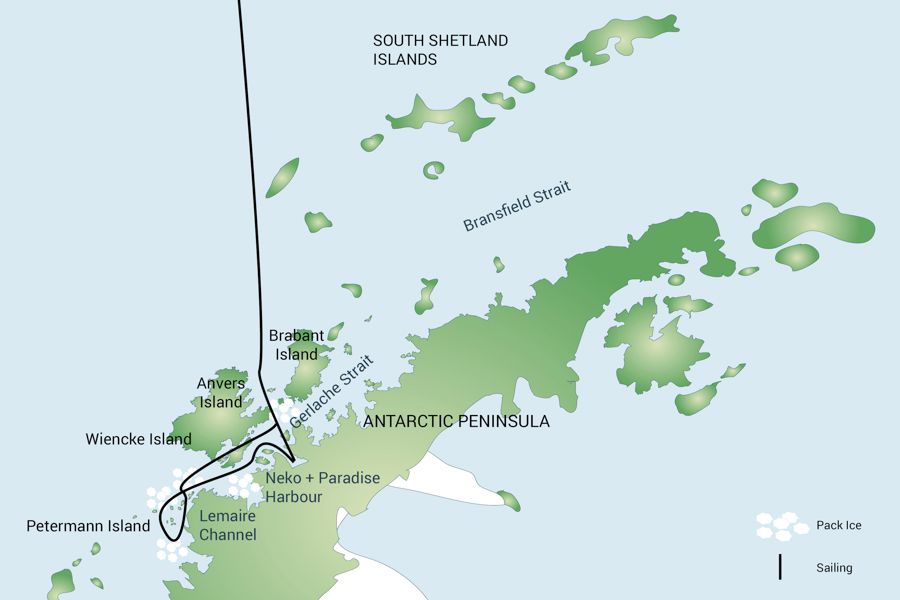 Unsere Reise führt uns direkt in das Herzstück der Antarktis “High Antarctica”, an Melchior Islands vorbei, durch den Schollaert Kanal zwischen Brabant und Anvers Island geht es gen Süden. Nein, wir träumen nicht, heute sind wir tatsächlich am Ende der Welt: graue, schneebedeckte Steingipfel, Türme aus gebrochenem blau-weißem Eis und eine völlig andere faszinierende Tierwelt ziehen unsere Blicke in ihren Bann. Unser Programm in den nächsten Tagen wird vor allem von den Wetter- und Eisbedingungen vor Ort abhängig sein. Zu unseren Zielen gehören: