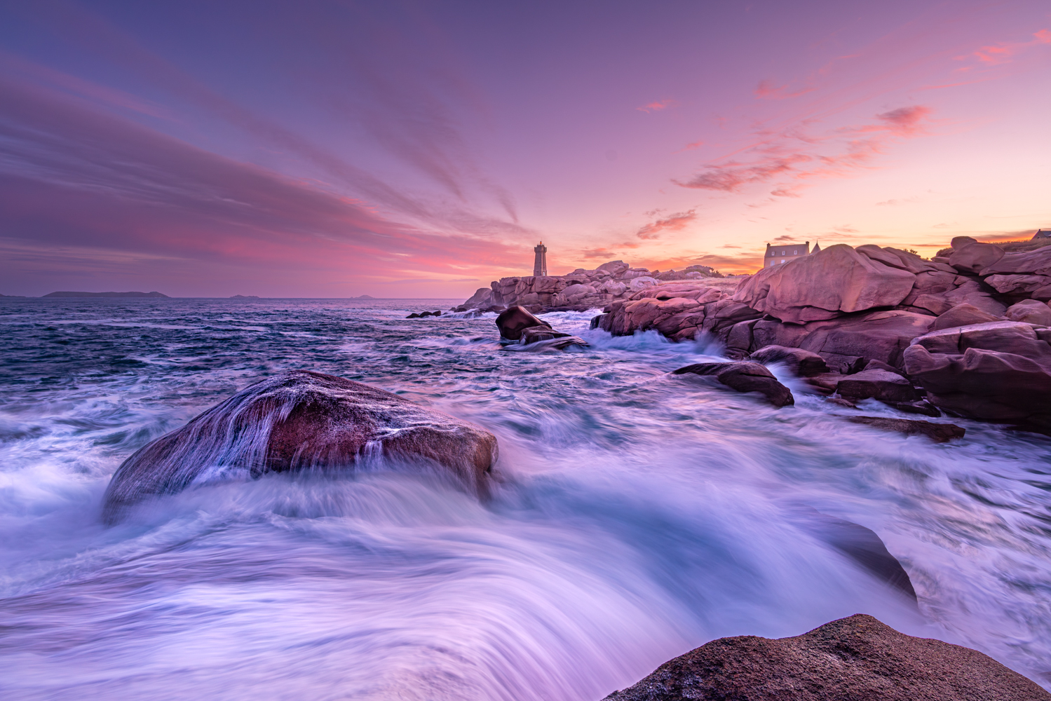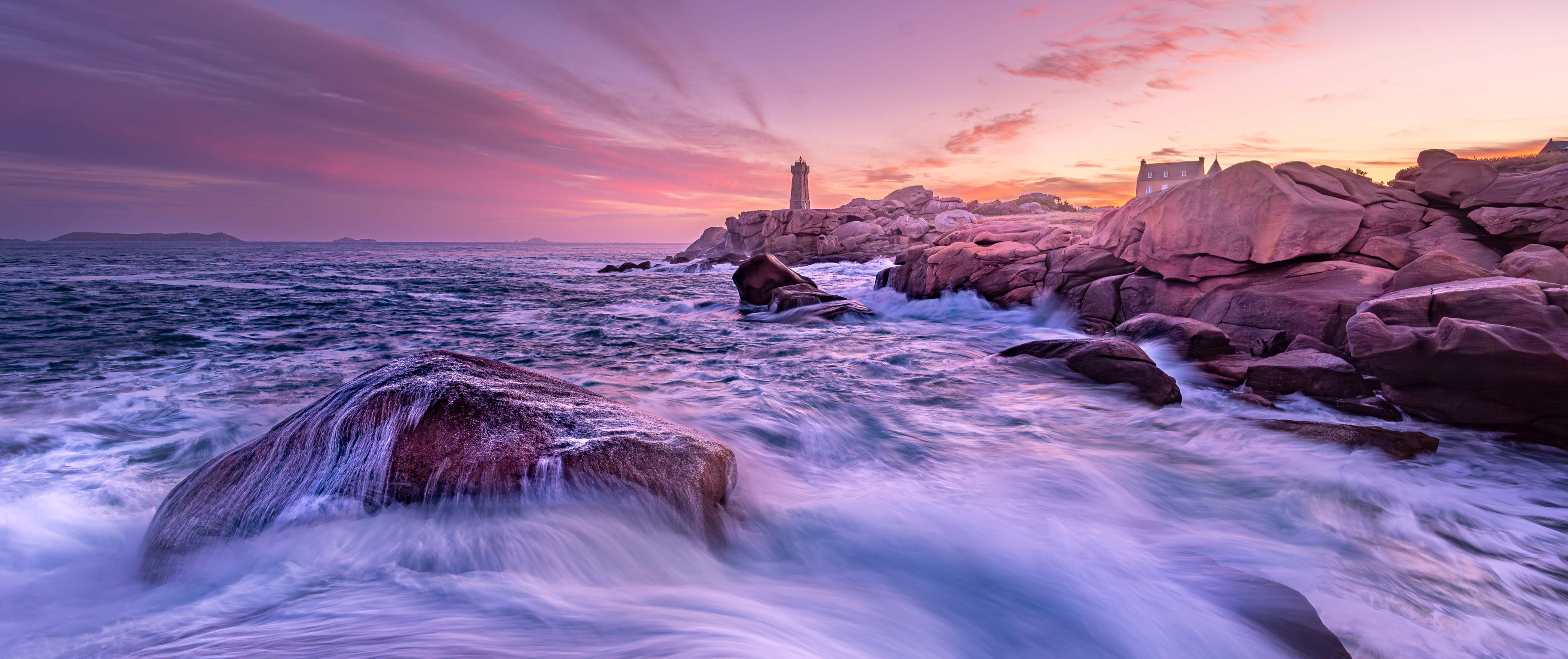 Am dritten Tag unserer Reise verlassen wir schon früh am Morgen das Hotel und machen uns auf den ca. eineinhalbstündigen Weg in Richtung Ploumanac’h, einem kleinen, verschlafenen Hafenort an der bretonischen Nordküste im Département Côtes d'Armor. Der vorgelagerte Küstenabschnitt ist für seine außergewöhnliche Schönheit weltbekannt: der Côte de Granit Rose – der rosafarbenen Granitküste. Wie der Name es bereits vermuten lässt, stapeln sich entlang der Küste so weit das Auge reicht bizarre, orange-rosafarbene Granitfelsen. Die Mineralien Hämatit und Alkalifeldspat rufen diese ungewöhnliche Färbung des 300 Millionen alten Gesteins hervor. Eine wahre Rarität, denn diese Art von Granit findet sich weltweit nur noch auf Korsika und in China. Nicht umsonst zählt das Küstengebiet damit zu den Highlights einer jeden Bretagne-Reise. Ob klein oder bis zu 20 Meter hoch, ob scharfkantig-spitz oder kugelrund: die unterschiedlichen Formationen der vom Meereswasser geschliffenen Steine kennen keine Grenzen – und bieten uns unendlich viele Möglichkeiten, diese atemberaubende Kulisse im sanften Licht kunstvoll in Szene zu setzen.