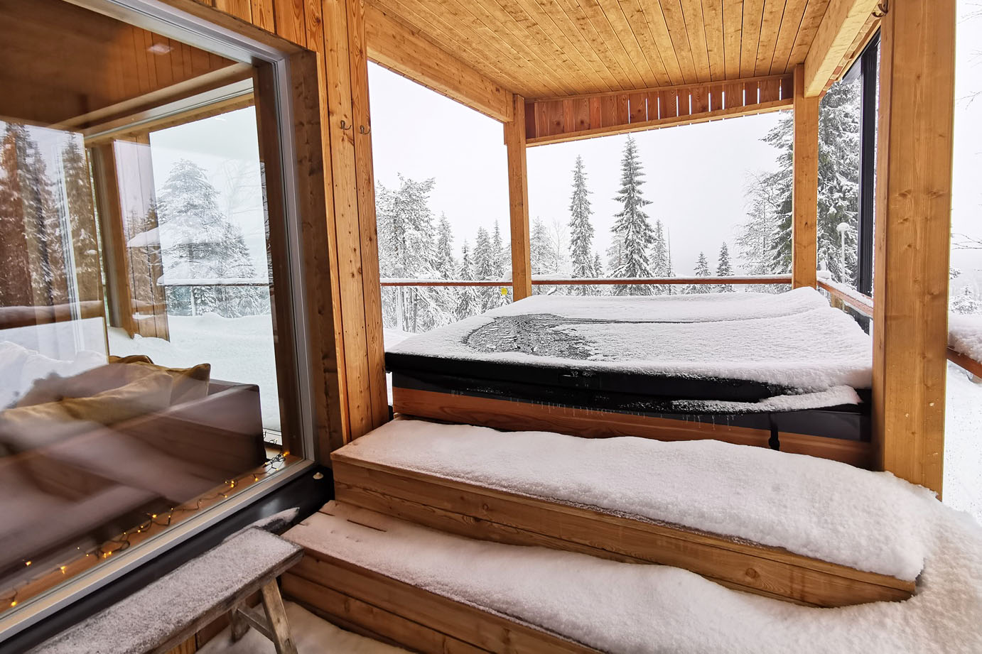Am Ende unserer Schneeschuhwanderung kehren wir mit vollen Speicherkarten in unser Cottage zurück, um uns intensiv zu erholen. Und natürlich sind wir nicht ausschließlich zum Fotografieren in die Arktis gereist. Während unseres fotografischen Abenteuers in Lappland darf auch das Wohlfühlen nicht zu kurz kommen. Deshalb machen wir, was ein Mensch in Finnland machen muss: wir gehen in die Sauna. Nach einem heißen Aufguss springen wir mutig in den kalten Schnee, der all unsere Lebensgeister weckt. Danach haben wir ein leckeres Essen verdient.