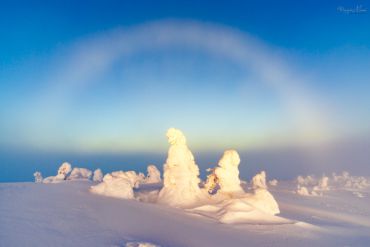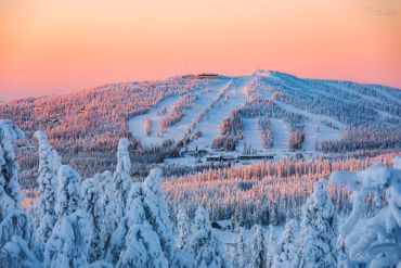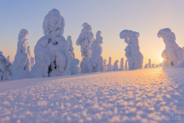 Es ist wieder sehr früh am Morgen, das Thermometer im finnischen Lappland zeigt starke Minusgrade, die Luft riecht nach Kälte & Schnee und ist zugleich unfassbar rein. Unser heutiges Ziel: einer der markantesten Berge in der Region Nordösterbotten im Nordosten Finnlands. Beeidruckende 432 Meter ragt er über den Meeresspiegel und bietet daher eine hervorragende Aussicht auf die umliegende Landschaft. Auf unserer ausgedehnten Schneeschuh-Fotowanderung durch die reinste Luft Nordeuropas begegnen wir märchenhaften Motiven. Der Schnee hat die Landschaft entlang der hügeligen Fjällkette überdeckt als hätte jemand Sahne aus dem Himmel darüber gegossen – ein weißer Teppich, der alles zudeckt und neue, bizarre Formationen hervor gebracht hat. Wir können uns kaum sattsehen und fotografieren zum Sonnenaufgang eine unaufgeregte Landschaft, die uns unmerklich verzaubert und tief durchatmen lässt.
