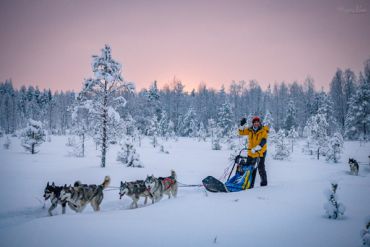 (*) Die Husky-Schlittensafari ist optional buchbar. Auf einer 7-8 km langen Strecke lenkt jeweils eine Person einen Schlitten, welcher von 4-6 Hunden gezogen wird. Um sicherzustellen, dass jeder Teilnehmer die Möglichkeit hat, sowohl aktiv am Schlittenerlebnis teilzunehmen als auch die beeindruckende Landschaft zu fotografieren, teilen wir uns in 2-3 Gruppen auf. Während jeweils eine Gruppe auf den Schlitten aktiv ist, haben die anderen Reise-Gäste die Gelegenheit, sich der Fotografie zu widmen, sei es mit einer Kamera oder einer Drohne. So kann jeder dieses einzigartige Abenteuer in vollen Zügen genießen und zugleich wertvolle Erinnerungen festhalten. Nach der Fahrt genießen wir ein traditionelles lappisches Wildfood-Essen mit lokalen Köstlichkeiten.