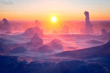 Es ist wieder sehr früh am Morgen, das Thermometer im finnischen Lappland zeigt starke Minusgrade, die Luft riecht nach Kälte & Schnee und ist zugleich unfassbar rein. Unser heutiges Ziel: einer der markantesten Berge in der Region Nordösterbotten im Nordosten Finnlands. Beeindruckende 432 Meter ragt er über den Meeresspiegel und bietet daher eine hervorragende Aussicht auf die umliegende Landschaft. Auf unserer ausgedehnten Schneeschuh-Fotowanderung durch die reinste Luft Nordeuropas begegnen wir märchenhaften Motiven. Der Schnee hat die Landschaft entlang der hügeligen Fjällkette überdeckt als hätte jemand Sahne aus dem Himmel darüber gegossen – ein weißer Teppich, der alles zudeckt und neue, bizarre Formationen hervor gebracht hat. Wir können uns kaum sattsehen und fotografieren zum Sonnenaufgang eine unaufgeregte Landschaft, die uns unmerklich verzaubert und tief durchatmen lässt.