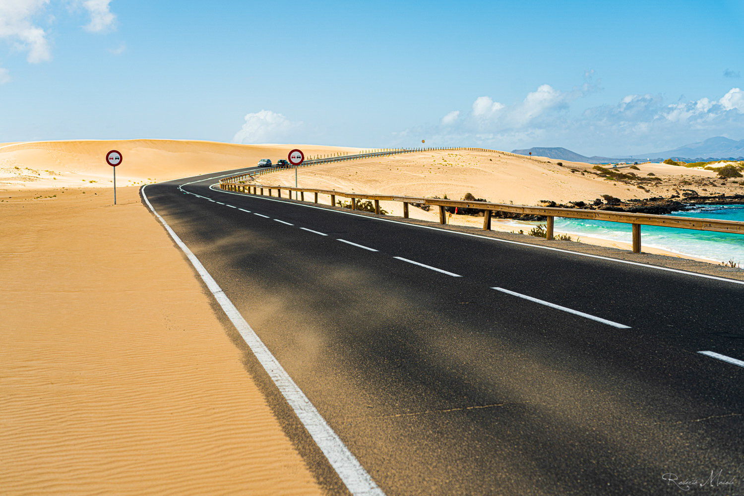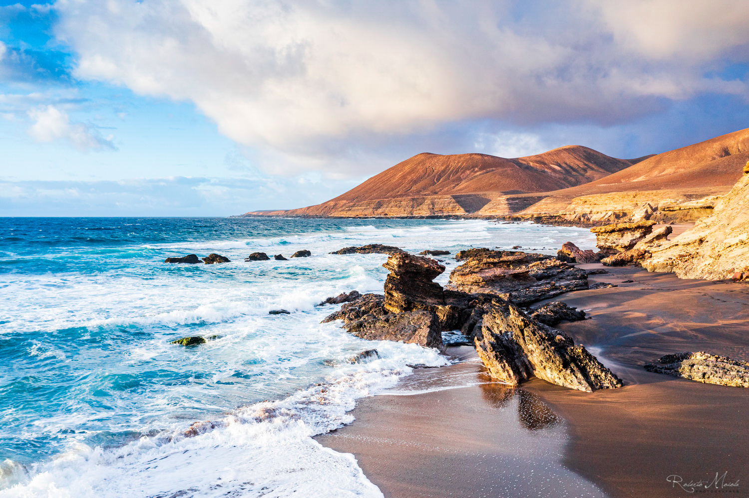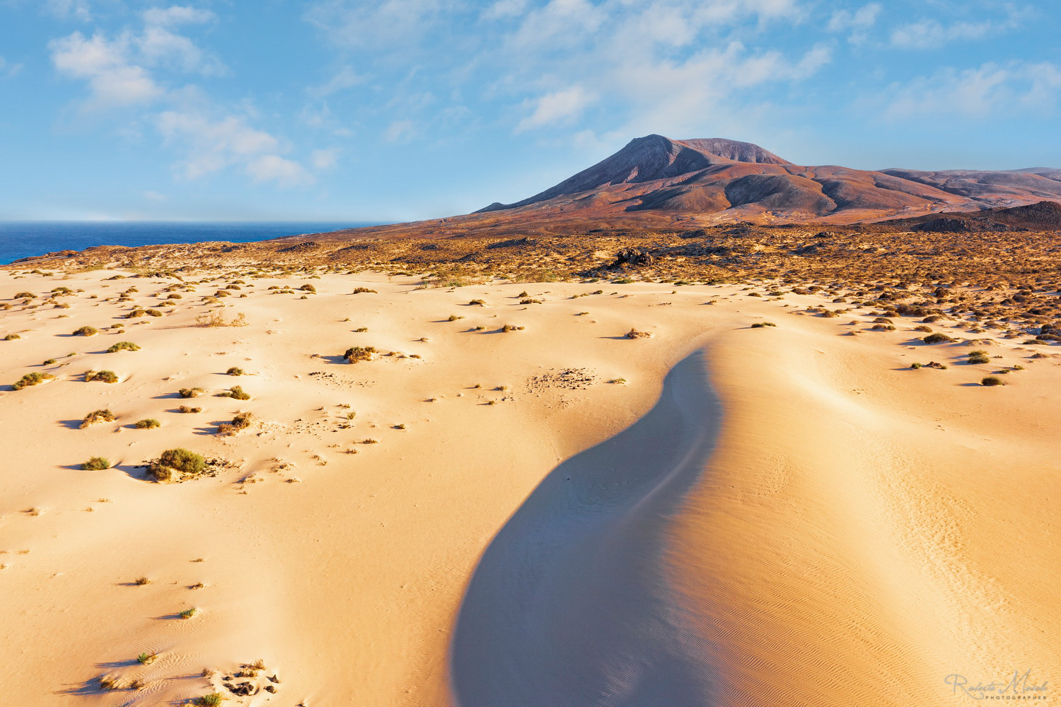 Meterhohe Sanddünen, zerklüftete Gebirgszüge und Vulkane geben der Insel eine besondere Note. Im Kontrast zu der schwarzen, verbrannten Erde, auf der nur wenige Büsche gedeihen, erstrecken sich türkis-blaue Lagunen, exotische Palmenhaine, Pinienwälder, wildes Meer und kilometerlange, einsame Sandstrände. Fuerteventura gilt als die wildeste und gleichzeitig unberührteste der kanarischen Inseln, welche neben ihrem hohen Erholungswert eine unglaubliche Vielfalt an Fotomotiven für Sie bereit hält.
