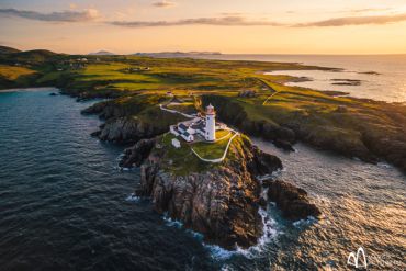 - „Fanad Head Lighthouse“ – einer der schönsten Leuchttürme Irlands - an den Klippen des rauen Atlantik im goldgelben Licht der aufgehenden Sonne