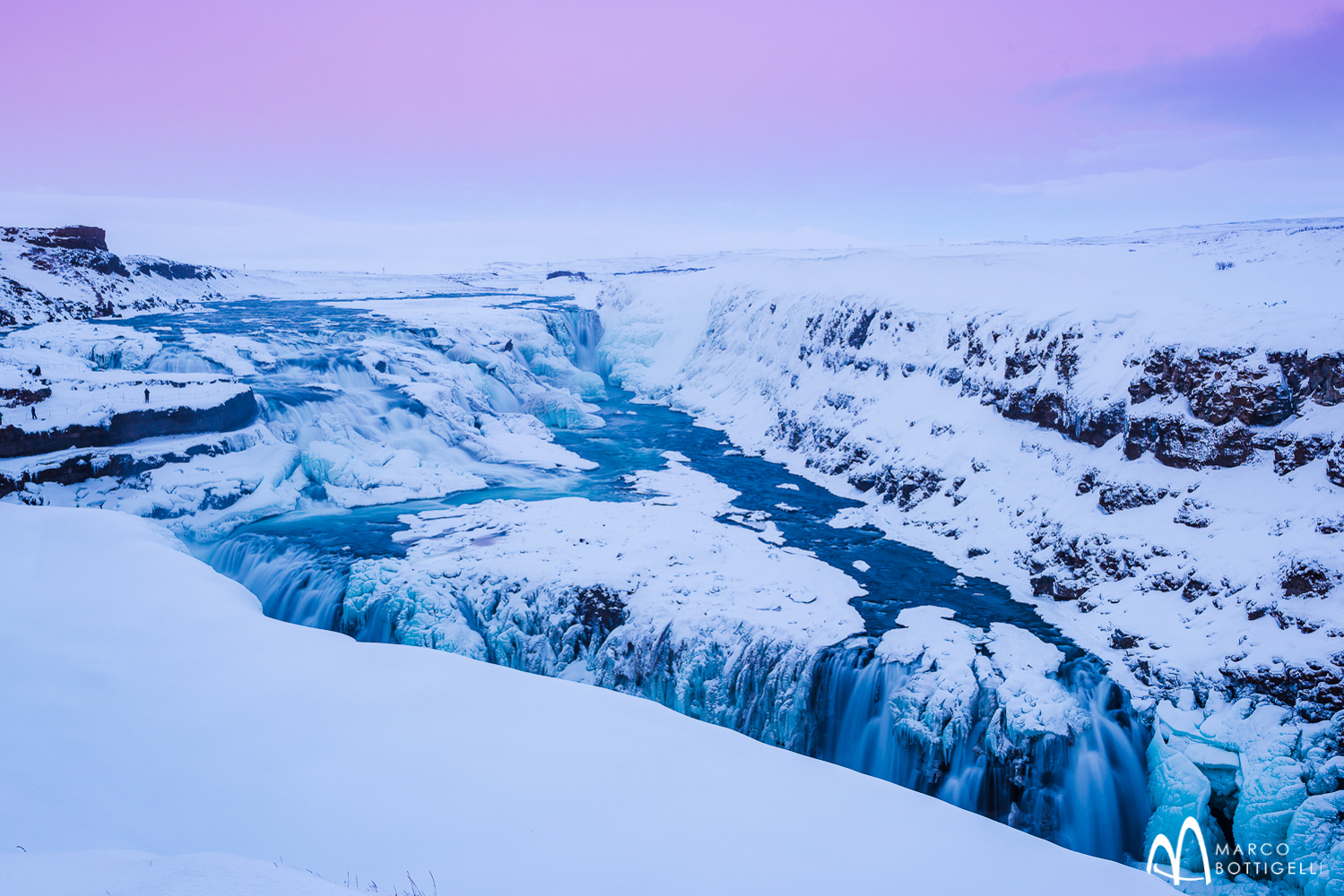 Und ein weiteres Highlight steht heute auf unserem Programm: wir fotografieren den Gullfoss, einen der schönsten und ikonischsten Wasserfälle Europas – auch „Goldener Wasserfall“ genannt. In der kalten Jahreszeit kommt man zwar nicht so dicht heran - aber auch in halb gefrorenem Zustand, wenn Eisbrocken mit in den Abgrund gerissen werden, bietet der Wasserfall eine spektakuläre Szenerie.