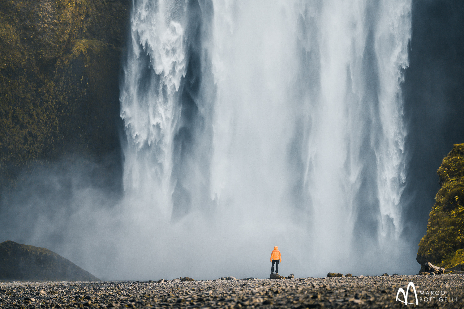 Der Skógafoss gilt dank seiner imposanten klassischen Form oft als monumentaler Fotohintergrund und Filmkulisse. Mehr als 60 Meter stürzt sein 25 Meter breiter, majestätisch anmutender Wasservorhang, in die Tiefe hinab. Obwohl man sich als Mensch in der Nähe dieser Naturgewalt sehr klein fühlt, wird einem klar, dass Schönheit auch in schroffen Formen und grober unbezähmbarer Kraft liegen kann.