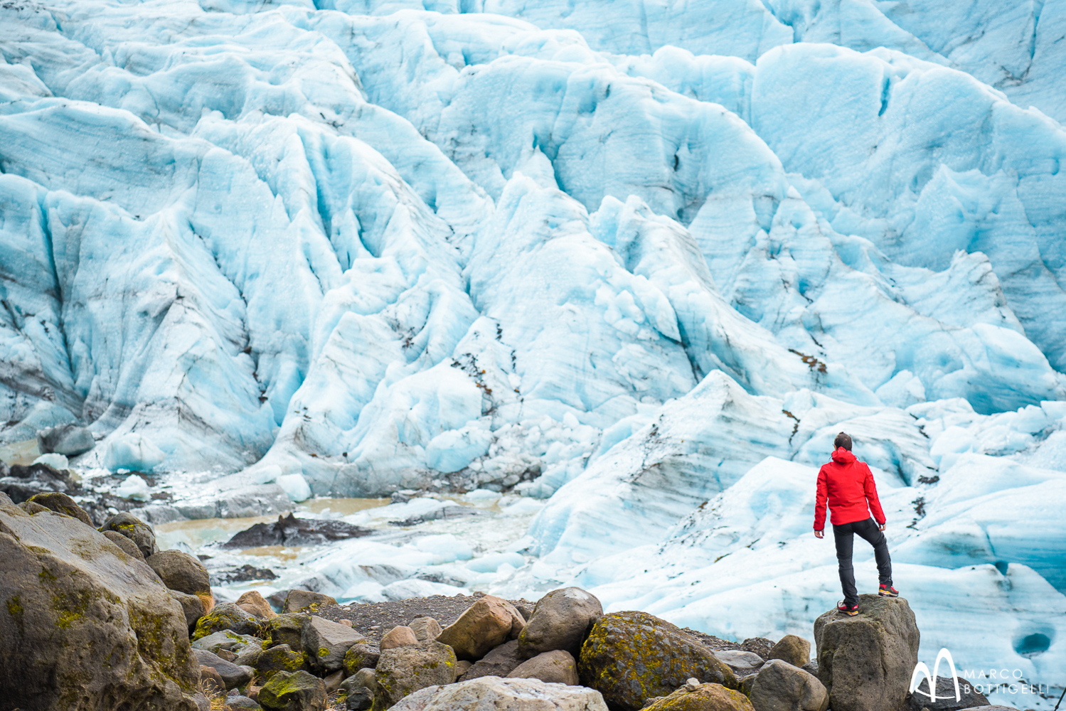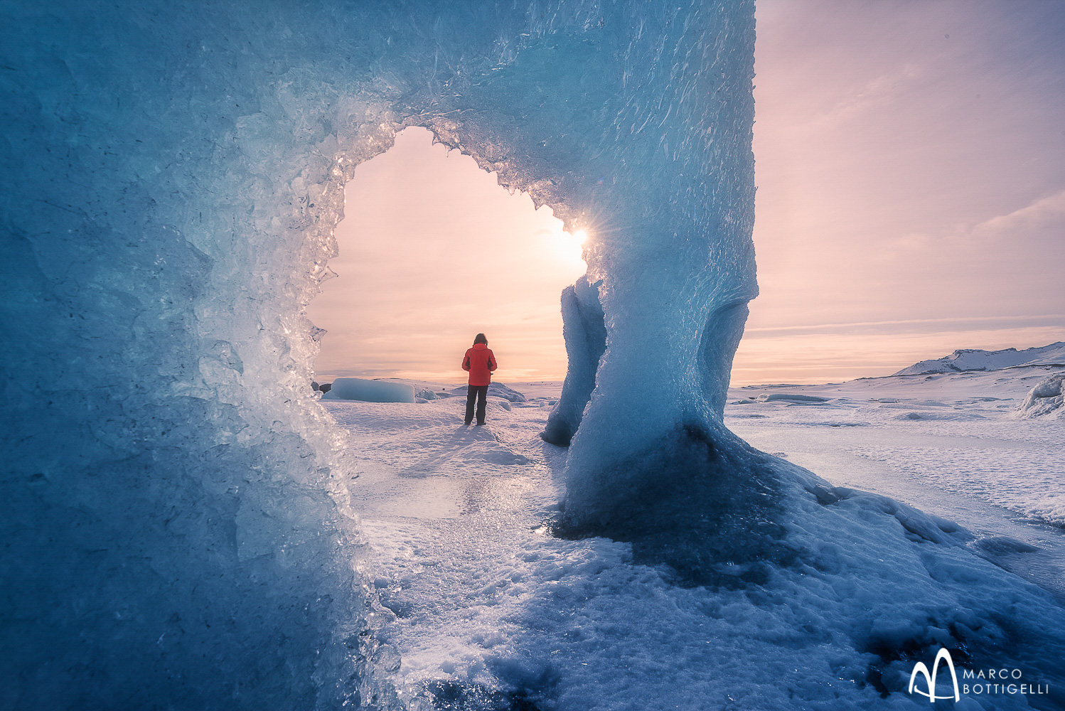 Während sich die meisten Touristen in den am leichtesten zugänglichen Eishöhlen versammeln, die für außergewöhnliche Fotomontagen weniger geeignet sind, nehmen wir an einer privaten Tour teil, die uns mit speziell umgebauten Autos ins Gelände zu einigen einzigartigen Eisformationen oben auf dem Vatnajökull-Gletscher führt.