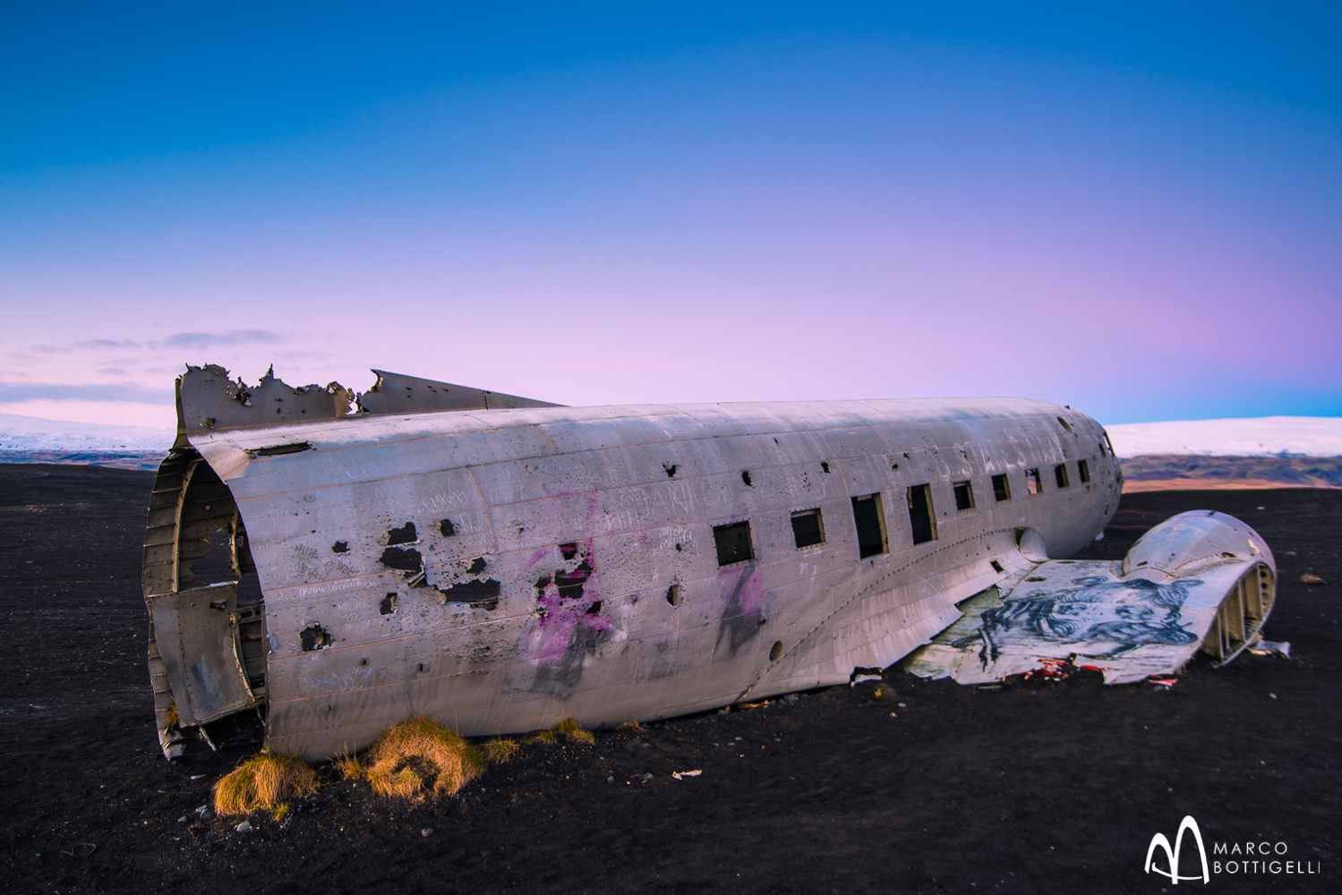 Nach Sonnenaufgang unternehmen wir, wenn es das Wetter erlaubt, eine Wanderung zu den Sólheimasandur Dünen, einer weiten Vulkanwüste, die sich über den Horizont erstreckt. In dieser abgelegenen Gegend stürzte im November 1973 ein US Navy DC-3 Flugzeug ab, es gab aber keine Toten. Was heute zurück bleibt, ist ein extrem fotogenes surrealistisches Objekt. Das robuste Wrack des Flugzeuges liegt mitten auf dem schwarzen Sand in Islands ansonsten unberührter Natur. Der perfekte Ort, um die Gedanken schweifen zu lassen und sich der Natur vollkommen hinzugeben.