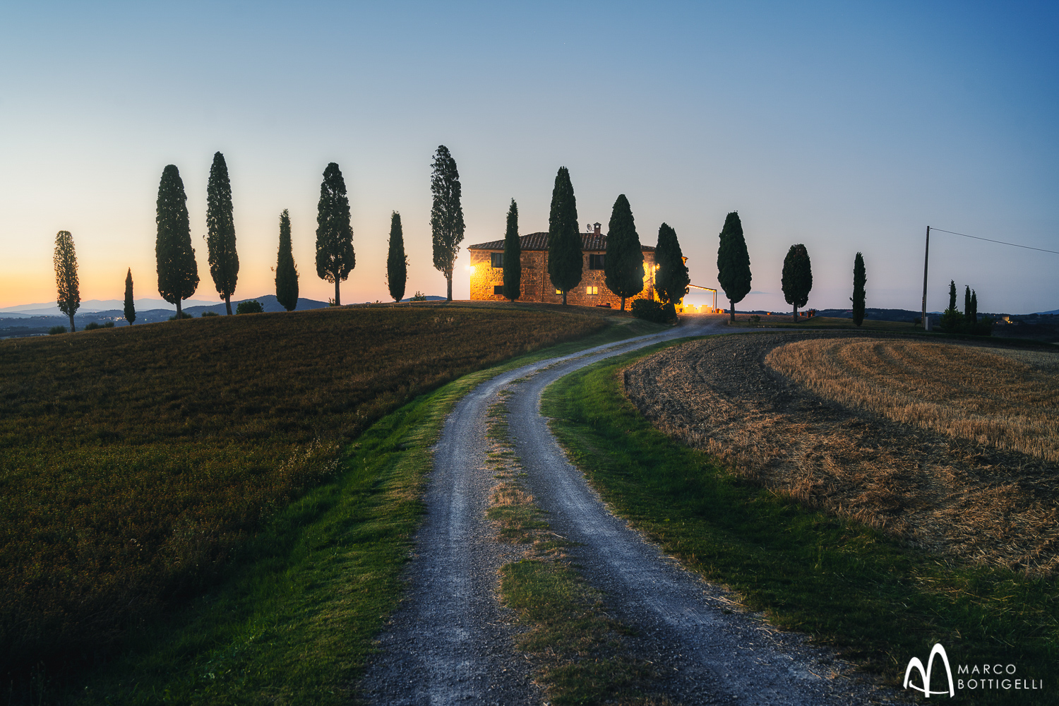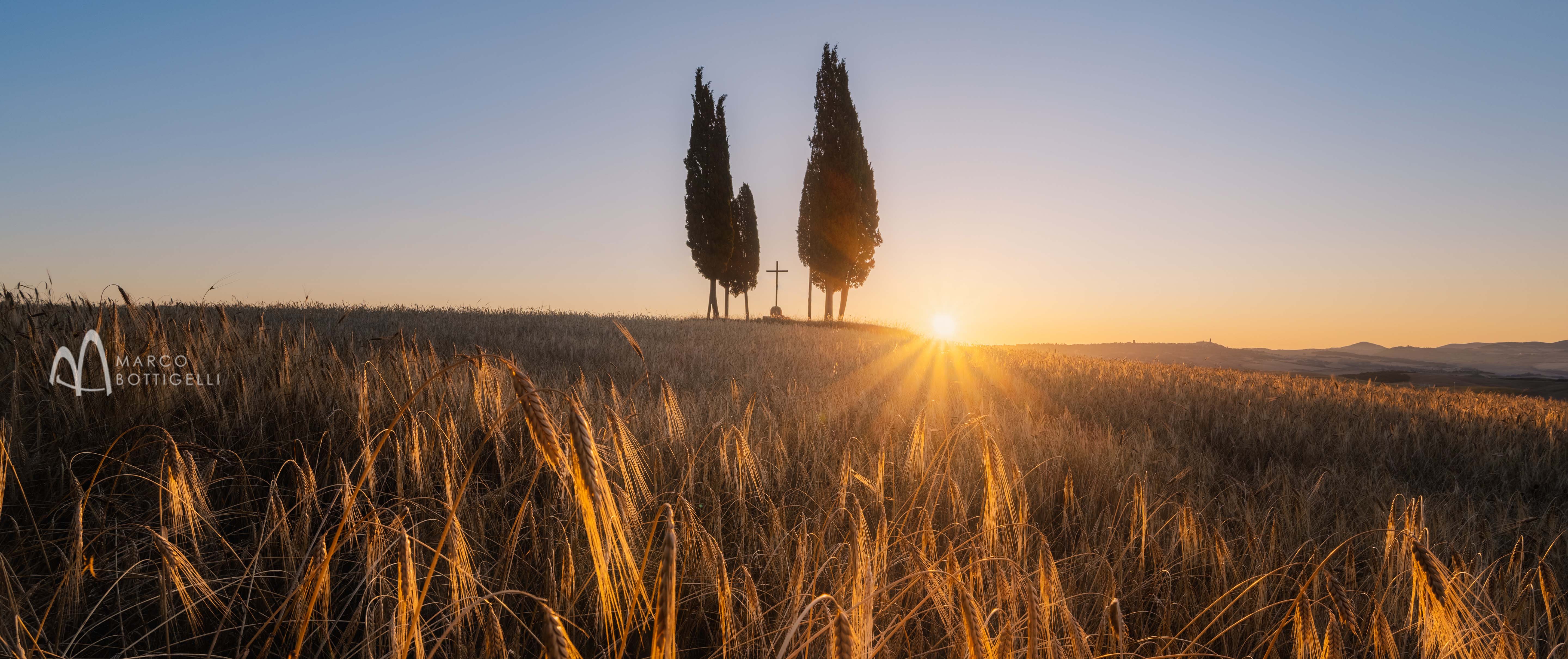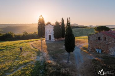 Und wieder heißt es: “Früh Aufstehen!” … so werden wir mit wundervollen Lichtstimmungen vor Sonnenaufgang belohnt. Unter all den typischen Fotos der eindrucksvollen toskanischen Landschaften sticht ein Motiv ganz besonders hervor: die Kapelle der Madonna di Vitaleta - oder auch La Cappella della Madonna Vitaleta. Geprägt von überirdischer, zeitloser Schönheit steht sie wie vergessen und einsam in der sanften grünen Hügellandschaft, gerahmt von Zypressen, die ihr zärtlichen Schutz gewähren. Eine Schirmpinie, die ein paar Schritte Abstand hält, rundet das Bild ab. Drumherum: sanft wogende Hügel und Kornfelder, die bis in die Unendlichkeit dahinrollen. Das hübsche kleine Gotteshaus ist eine der am häufigsten fotografierten Kirchen in der Toskana und ein Prachtstück wie aus einem Bilderbuch. Die Kapelle ist einschiffig und hat eine Fassade aus Rapolano-Stein, in der über dem Architrav-Portal eine Fensterrose von ewiger Schönheit prangt. Sie wurde erst in jüngster Zeit zur UNESCO Weltkulturerbe Stätte ernannt. Reinster Frieden herrscht hier und eine mystische Stille, die nahezu surreal erscheint. Aber alles ist echt und wir fotografieren diese stimmungsvolle Stätte in der Toskana mit ihren umliegenden Feldern im diffusen Morgenlicht.