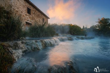 Unsere fotografische Entdeckungsreise neigt sich leider schon dem Ende zu. Lange vor Sonnenaufgang wachen wir auf, um den letzten Ort unserer Reise, die magischen heißen Quellen von Saturnia, rechtzeitig zu erreichen. Über Stufen und kleine Wasserfälle verteilt, erstreckt sich die Schwefeltherme im dem kleinen Dorf. Dichter Dampf steigt vor uns auf, während das türkisblaue Wasser im Sonnenschein glitzert. Ein faszinierender Augenblick, wenn das erste diffuse Licht des Tages auf die Dämpfe des himmelblau schimmernden Thermalwassers treffen. Wir halten die Momente in unseren Bildern fest und lassen uns die Chance nicht nehmen, unsere Tour mit einem wohltuenden Bad im warmen Thermalwasser zu krönen. Abgesehen davon, dass uns die Schwefeltherme einen herrlichen Foto-Spot bietet, hat das Saturniawasser bekanntlich heilende Kräfte. Es gilt als ein natürliches Kosmetikum und quasi Allheilmittel für eine ganze Reihe chronischer Krankheiten.