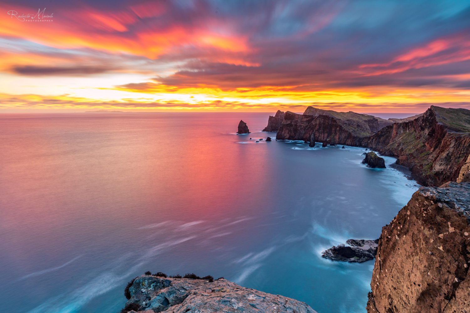 Langsam neigt sich der letzte Tag unserer unvergesslichen Fotoreise dem Ende zu. Die bevorstehende Sunset-Foto-Session am Ponta do Rosto bietet uns die letzte Gelegenheit, die atemberaubende Schönheit und den Zauber Madeiras in vollen Zügen zu genießen und noch einmal intensiv auf uns wirken zu lassen. Der Miradouro da Ponta do Rosto, ein Aussichtspunkt, der auf der zum Naturdenkmal erklärten Halbinsel São Lourenço liegt, bietet eine seltene Besonderheit: Von hier aus können wir sowohl die Nord- als auch die Südküste der Insel Madeira sehen. Diese einzigartige Perspektive lässt uns die dramatischen Kontraste der Insellandschaft in ihrer vollen Pracht erleben. Die steilen Küstenklippen, die sich majestätisch aus dem Meer erheben, bieten eine malerische Kulisse, die von der Natur selbst geschaffen wurde. Während die Sonne langsam Richtung Horizont sinkt, taucht sie die Landschaft in ein warmes, goldenes Licht. Die Farben des Himmels verwandeln sich in ein Kaleidoskop aus Orange, Rosa und Violett, das die steilen Klippen und das sanft bewegte Meer in ein magisches Licht hüllt. Die Wellen brechen sanft gegen die Felsen und erzeugen ein beruhigendes Rauschen, das die friedliche Atmosphäre verstärkt.