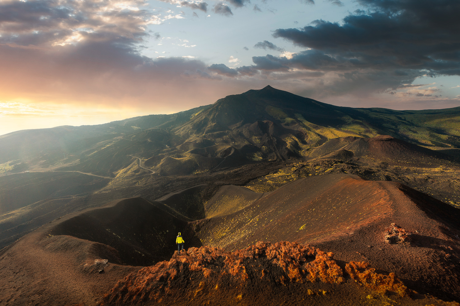 Am späten Nachmittag erreichen wir einen der strategisch gelegenen Aussichtspunkte, um uns für das große Finale vorzubereiten: den Sonnenuntergang über dem Ätna. Sobald das Licht weicher wird, beginnt die Landschaft zu glühen – in tiefem Gold, rostigem Orange und einem Hauch von violetter Glut, die sich über Hänge und Himmel legt. Der Vulkan wirkt nun wie eine lebendige Skulptur, wechselhaft und majestätisch zugleich. In der Blauen Stunde entstehen Bilder, die mehr sind als Dokumentation – sie erzählen von der Kraft der Elemente, von Stille, Größe und Vergänglichkeit.