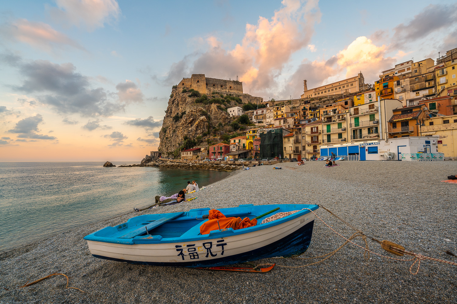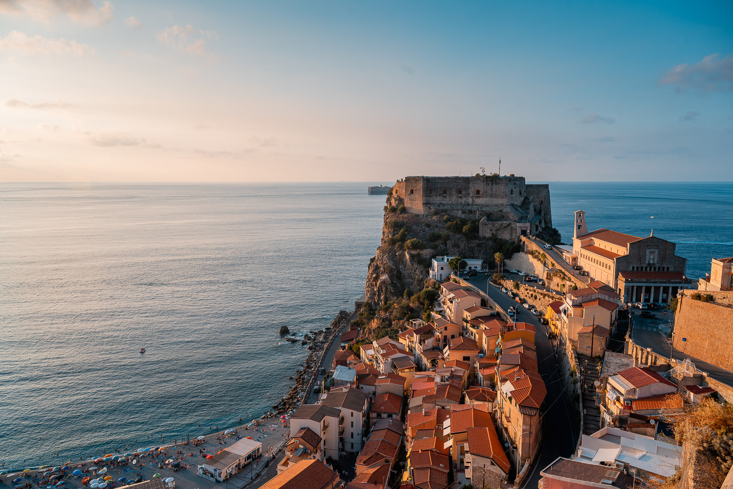 Zum Sonnenuntergang ziehen wir hinauf zur Festung Ruffo, die über dem Ort thront. Von dort aus erleben wir ein unvergessliches Farbenspiel: Wenn die Sonne im Tyrrhenischen Meer versinkt, taucht sie die Küste in flammendes Gold, die Gassen in sanftes Rosa – ein Moment, der auf jedem Sensor nachklingt und gleichzeitig eine traumhafte Kulisse für atmosphärische Aufnahmen bietet. Nach einem facettenreichen Tag lassen wir den Abend beim gemeinsamen Abendessen mit Blick aufs Meer ausklingen – begleitet von frischem Fisch, regionalem Wein und dem Rauschen der Brandung.