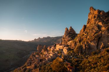 - Mystische Felsen und verborgene Ruinen von Pentedattilo im goldenen Licht