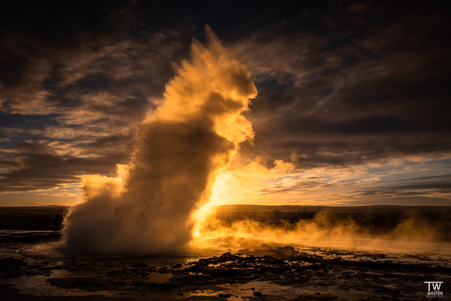 Im Anschluss daran starten wir unser erstes nächtliches Islandabenteuer. Am beeindruckenden Wasserfall Gullfoss warten tosende Wassermassen, gewaltige Kräfte und eine glänzende Gischt darauf, von Ihnen aus nächster Nähe fotografiert zu werden. Nach diesem spektakulären Erlebnis besuchen wir Islands aktivsten Geysir namens Strokkur. Umgegeben von rauchenden und brodelnden Quellen schießt die glühend heiße Wasserfontäne alle acht bis zehn Minuten in die Luft. Aufgrund der Anreise am gleichen Tag möchten wir gern das Ende dieser Fotonacht von den Energiereserven der Reisegruppe abhängig machen.