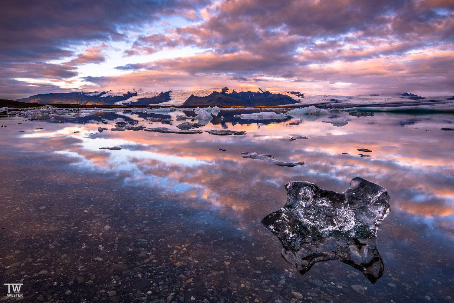 Am frühen Abend im Hotel angekommen, erholen wir uns zunächst ein wenig von der Fahrt und stärken uns anschließend gemeinsam für den nächtlichen Fotoausflug. Dieser führt uns auf direktem Wege zur Gletscherlagune Jökulsárlón, die sich vor einer beeindruckenden Gletscherkulisse erstreckt. Vom trockenen Ufer aus werden wir die im Wasser schwimmenden Eisblöcke und -schollen fotografisch einfangen. Die unterschiedlichen Größen und Formen der Eisskulpturen bieten uns zahlreiche Möglichkeiten einer ausdrucksstarken Bildkomposition – besonders spektakulär im Licht der tief stehenden Sonne.