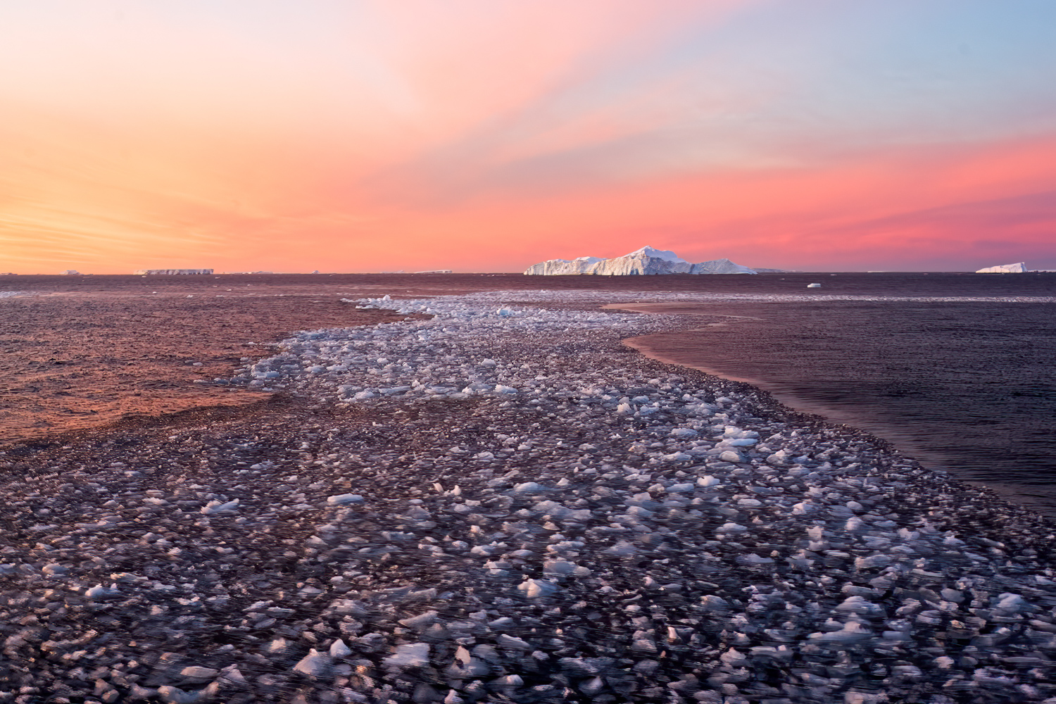 Mit jeder Seemeile verändert sich die Szenerie: Eisberge treiben wie monumentale Skulpturen vorbei – manche glatt und tiefblau wie Glas, andere zerklüftet und schroff, als hätte der Wind selbst sie geformt. In schmalen Passagen spiegeln sich ihre Konturen im stillen Wasser, während das Knacken und Grollen von brechendem Eis zwischen den Felswänden widerhallt.