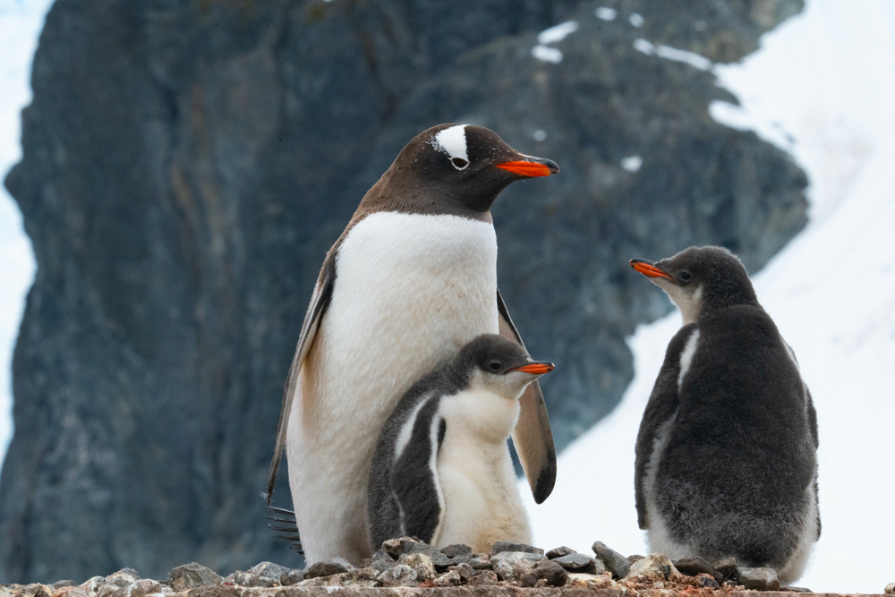 Gourdin Island: Bald erreichen wir Gourdin Island, eine kleine, dem Festland vorgelagerte Insel in der Bransfield Strait. Etwa 15.000 Paare Adéliepinguine brüten auf der Insel. Dazu noch einige Hundert Paare Zügelpinguine. Es herrscht ein ständiges Kommen und Gehen in den Kolonien. Am Strand sammeln sich die Pinguine in Gruppen und beobachten das Meer, bevor sie gemeinsam ins Wasser springen. Tausende Motive von Pinguinküken und der wunderschönen Felslandschaft lassen die Kameras heiß laufen. Niemand mag sich von der Szenerie trennen, bis wir später leider wieder Abschied nehmen müssen.