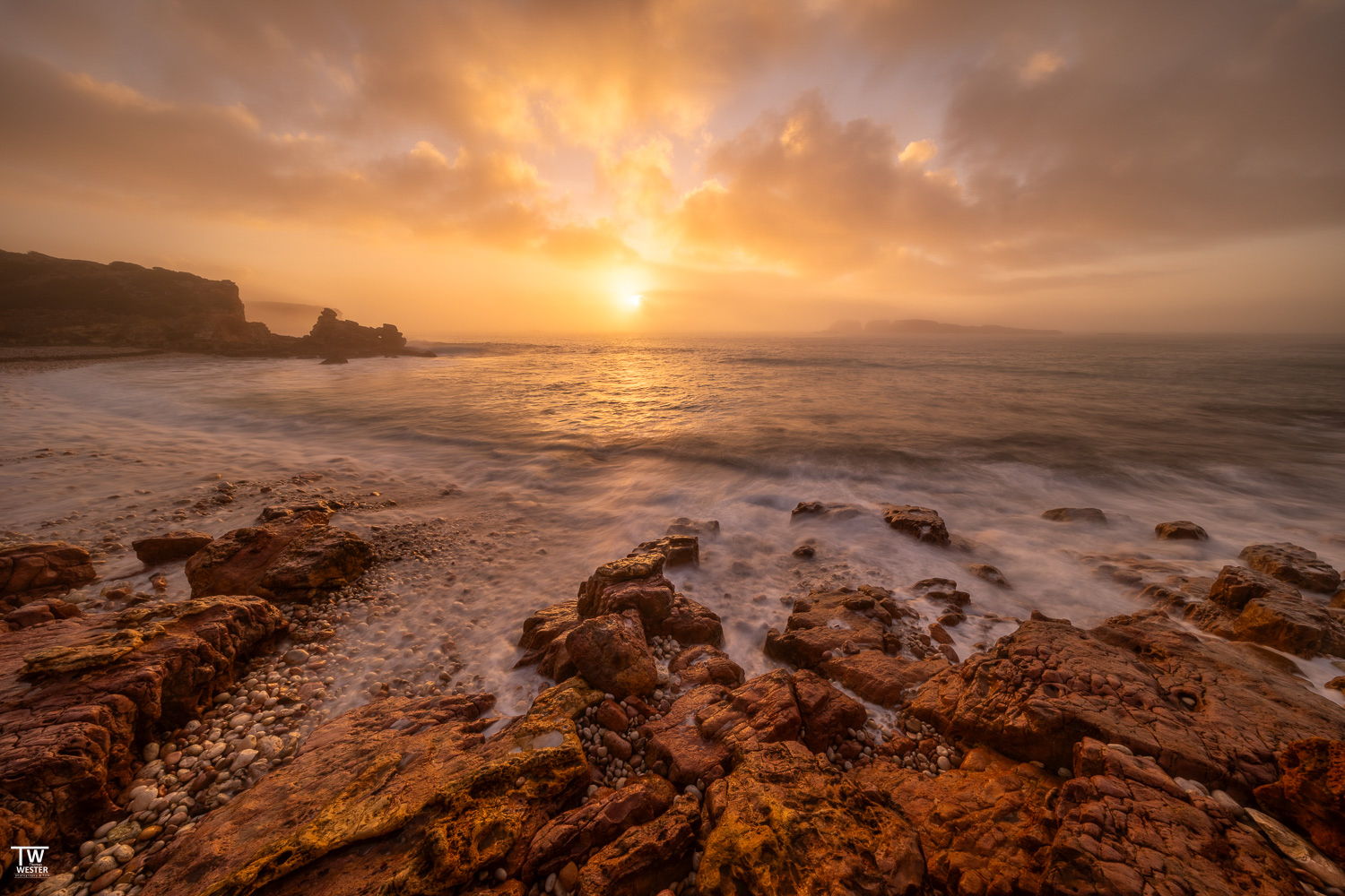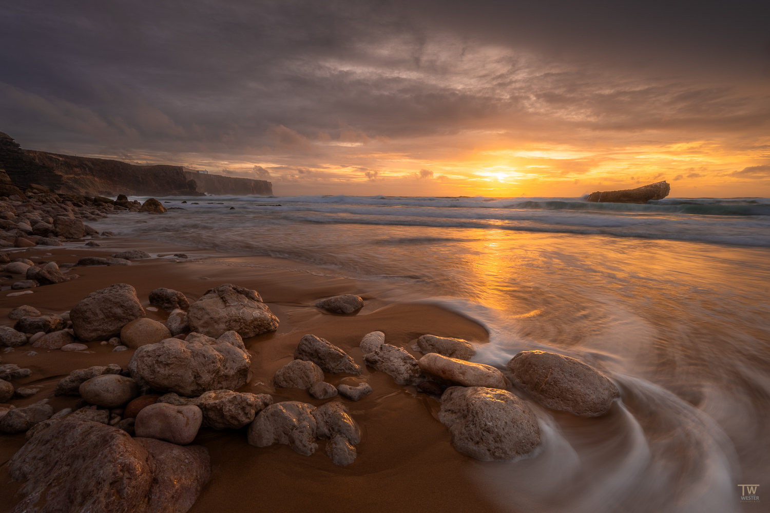 Am Abend führt uns unsere Reise zu einem ganz besonderen Refugium: der Praia do João Vaz. Dieser versteckte Küstenabschnitt liegt fernab vom Trubel und trägt eine fast mystische Energie in sich. Die Szenerie ist schlicht atemberaubend: die Weite des Meeres, das stetige Rauschen der Wellen, das goldene Licht, das sich auf den rauen Felsen spiegelt. Ein Ort, der nicht nur fotografisch berührt, sondern auch emotional nachklingt und diesen Tag auf eine ganz besondere Weise abrundet.
