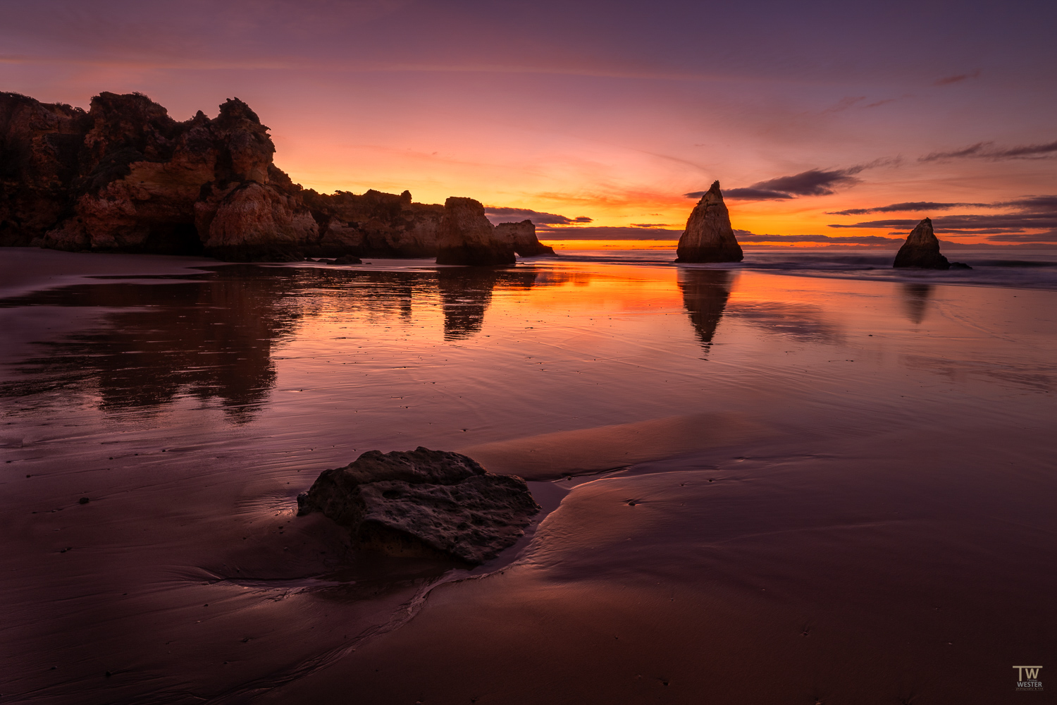 Die Praia dos Arrifes empfängt uns mit einer eindrucksvollen Szenerie aus goldenen Felsformationen, die wie kleine Inseln aus dem türkisfarbenen Wasser ragen. Die markanten Felsnadeln, Bögen und zerklüfteten Strukturen bieten eine Vielzahl an Kompositionen und laden dazu ein, mit Perspektiven, Linien und Licht zu spielen. Im Anschluss begeben wir uns zur Praia do Evaristo: einem eher kleinen, ruhigen Strand, der sich durch seine besondere Nähe zu den Felsen auszeichnet. Hier verschmelzen Land und Meer auf ganz eigene Weise: sanft ausgewaschene Felsplatten treffen auf kleine Buchten, das Wasser schimmert in unterschiedlichen Blautönen, und zwischen den Steinen entstehen bei ruhiger See spiegelnde Wasserflächen. Mit etwas Glück erleben wir hier einen stimmungsvollen Sonnenuntergang, wenn das Licht weicher wird und die gesamte Szenerie in warme, goldene Töne taucht. Ein ruhiger, intensiver Abschluss dieses Tages, den wir gemeinsam fotografisch festhalten und wirken lassen.