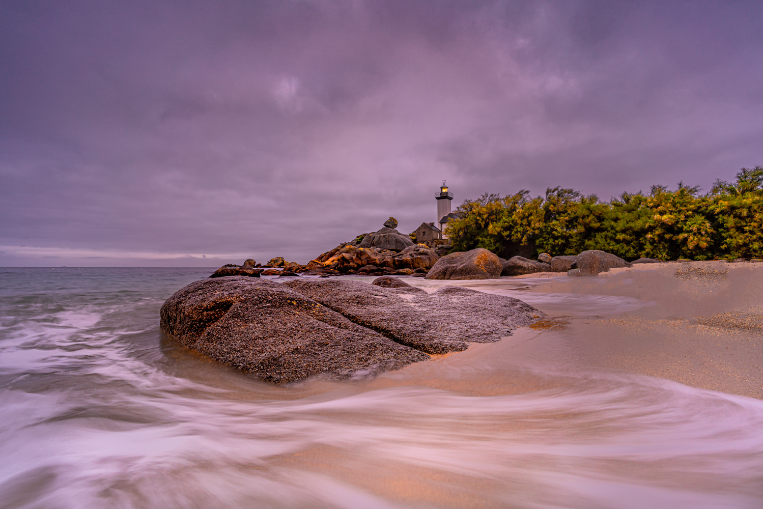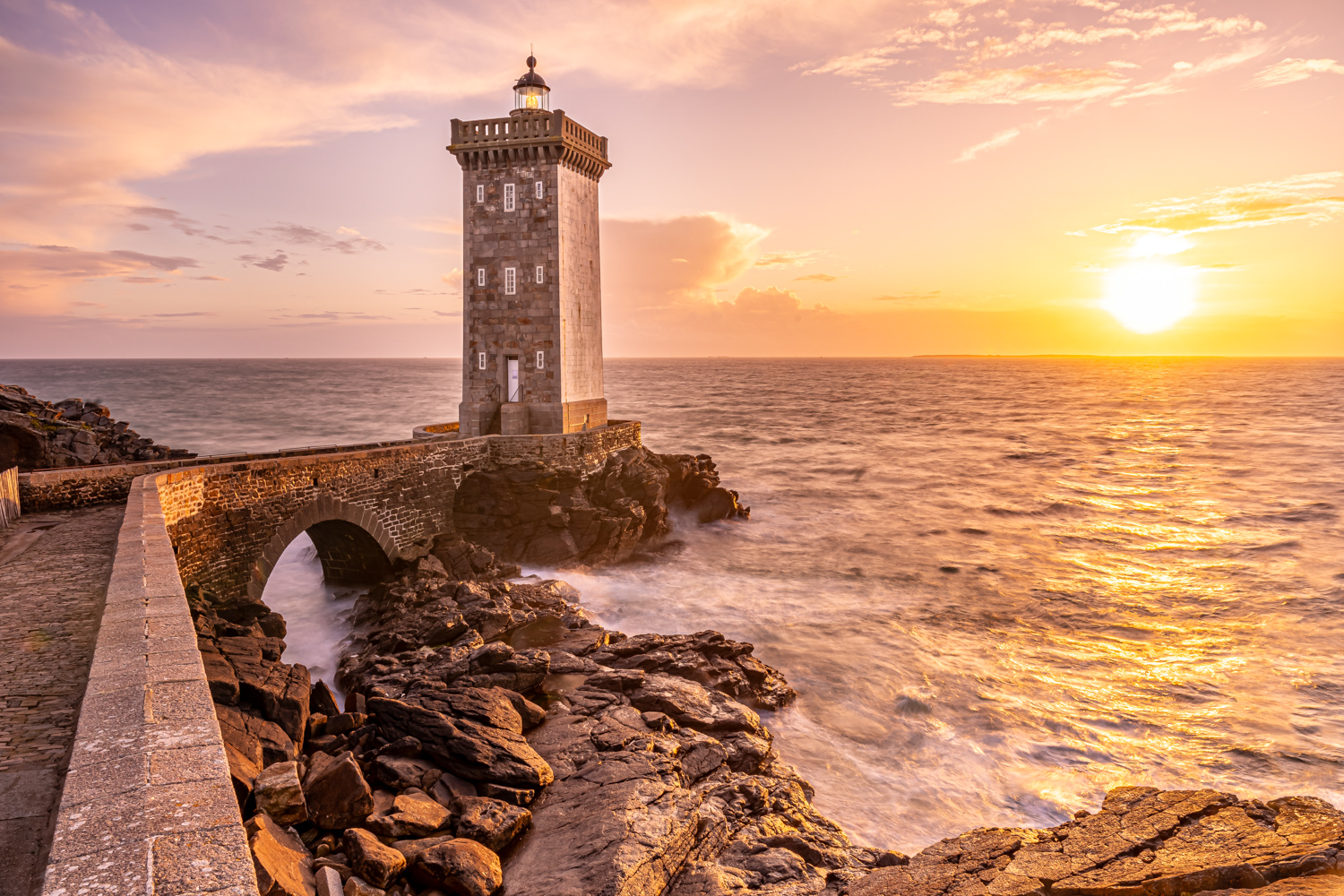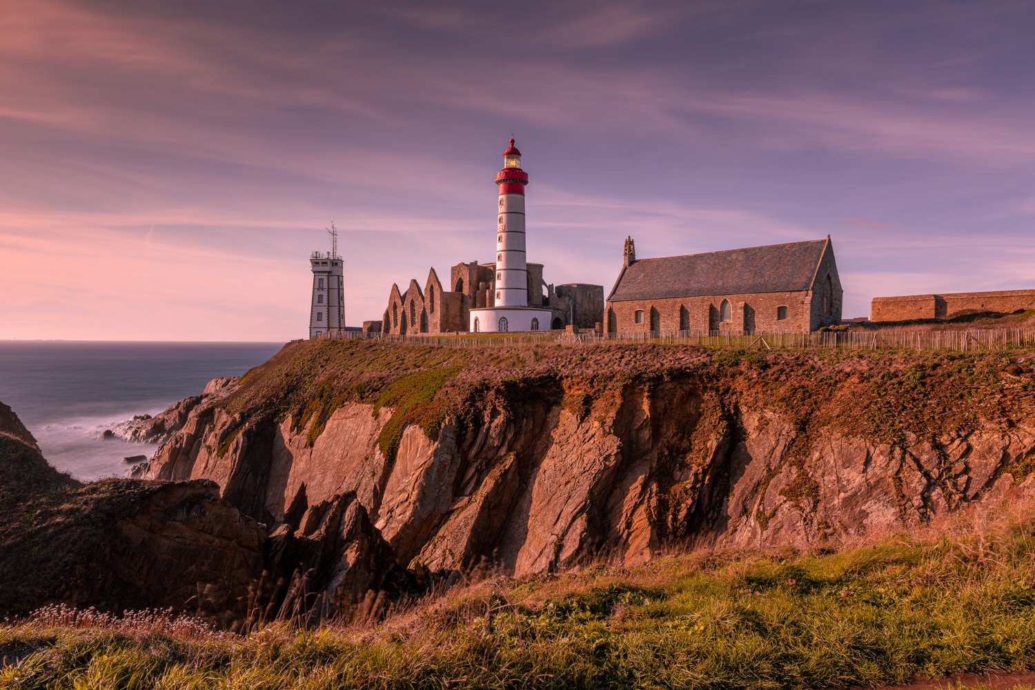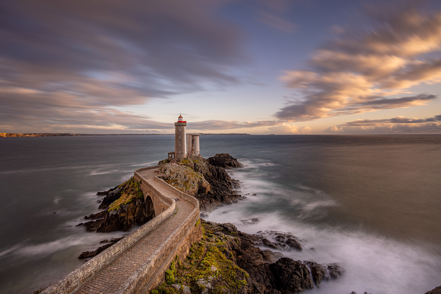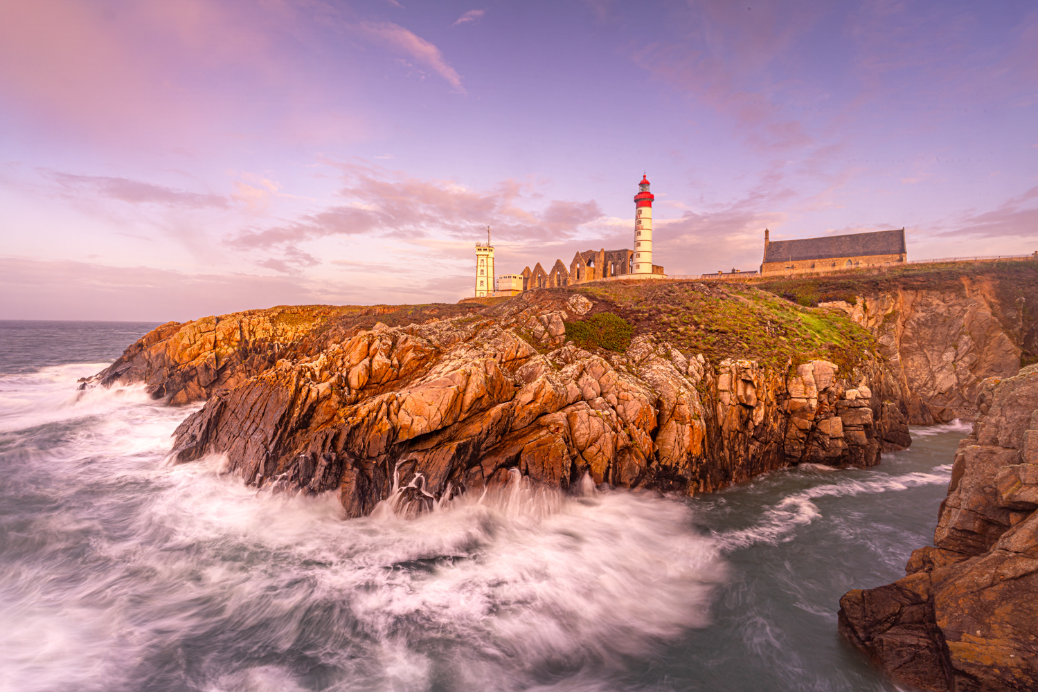 Bevor wir zu unserer nächsten Unterkunft aufbrechen, suchen wir in den frühen Morgenstunden vor Sonnenaufgang einen spektakulären Küstenabschnitt auf der Landspitze Saint-Mathieu auf. Die gleichnamige Landzunge befindet sich in der französischen Gemeinde Plougonvelin im Département Finistère und erstreckt sich weitläufig in den atlantischen Ozean. Sie gilt als einer der westlichsten Felsvorsprünge Europas. An einem etwa 20 Meter hohen Kap fesseln uns steile Felsklippen, das dröhnende Toben der Atlantikwellen, tiefe Schluchten und der überwältigende Ausblick auf den schier grenzenlosen Horizont. Unzählige Fotomotive warten darauf, im sanften Morgenlicht von uns eingefangen zu werden. Unsere Mission: malerische Langzeitbelichtungen kreieren. Doch nicht nur die Schönheit der Küstenlandschaft, sondern auch der eindrucksvolle Leuchtturm Phare de Saint-Mathieu – erbaut im Jahre 1835 – genießt unsere fotografische Aufmerksamkeit. Umrahmt von einer alten Ruine sowie der Kirche Chapelle Notre-Dame des Grâces bietet der 37 Meter hohe Turm vor der mächtigen Kulisse des Atlantiks einen imposanten Anblick.