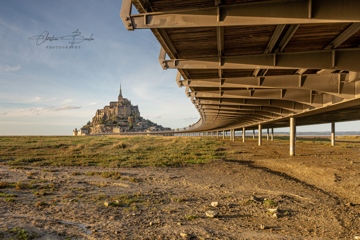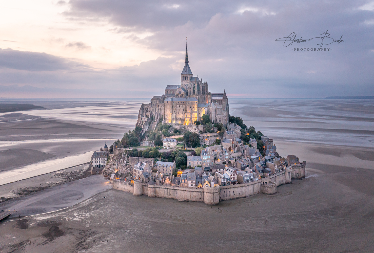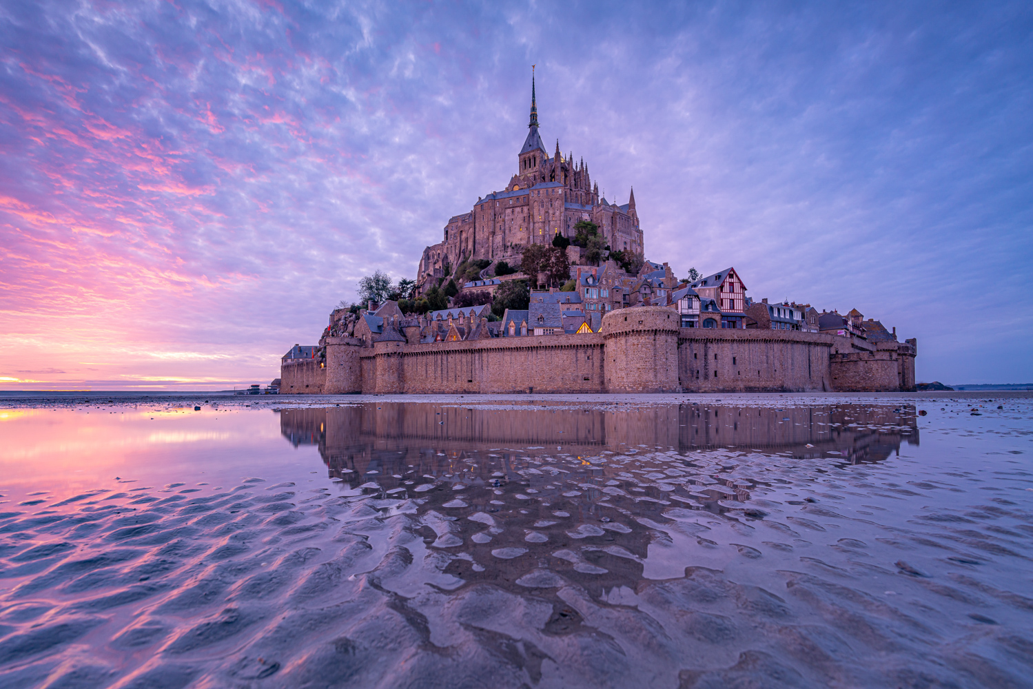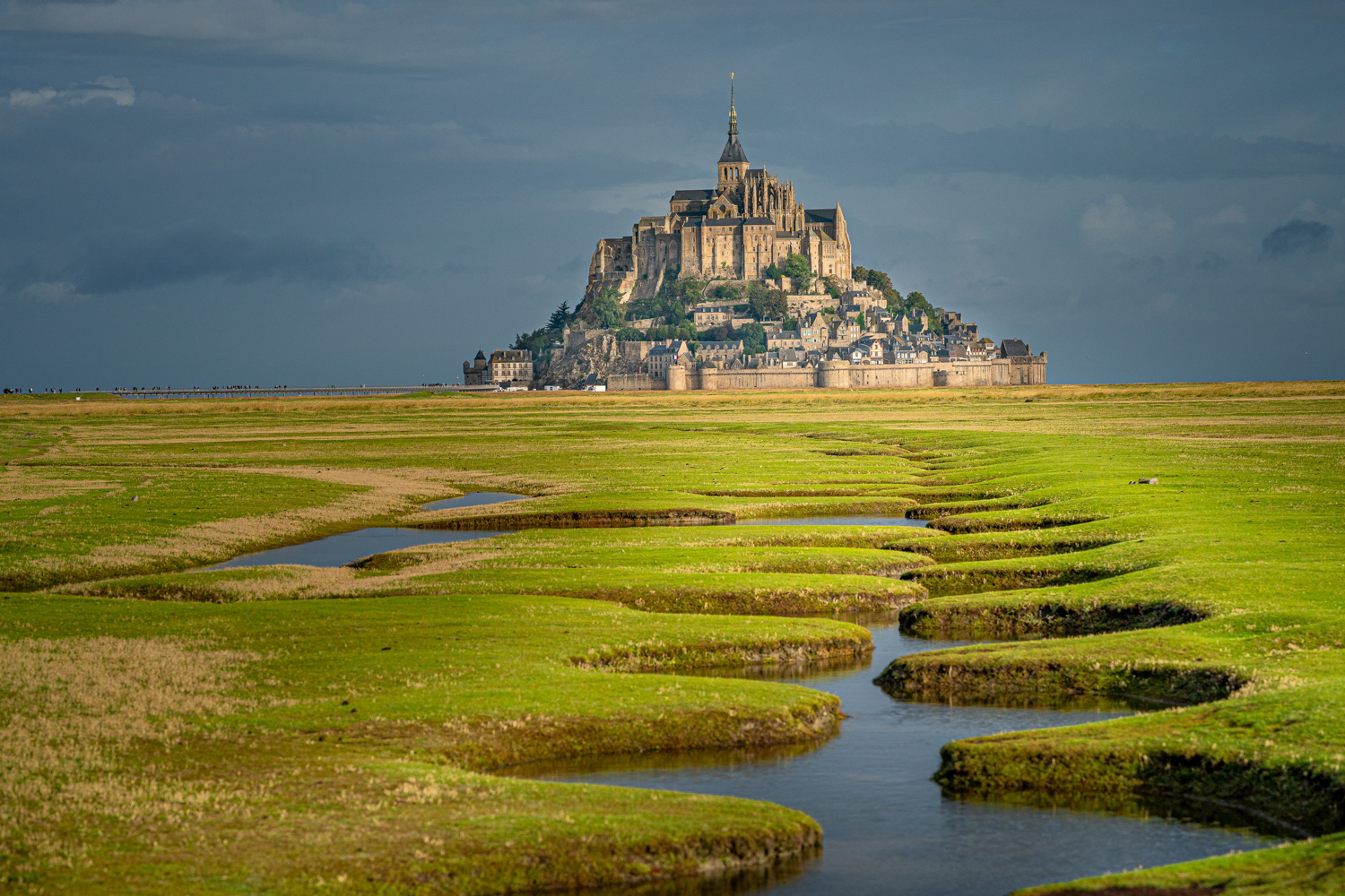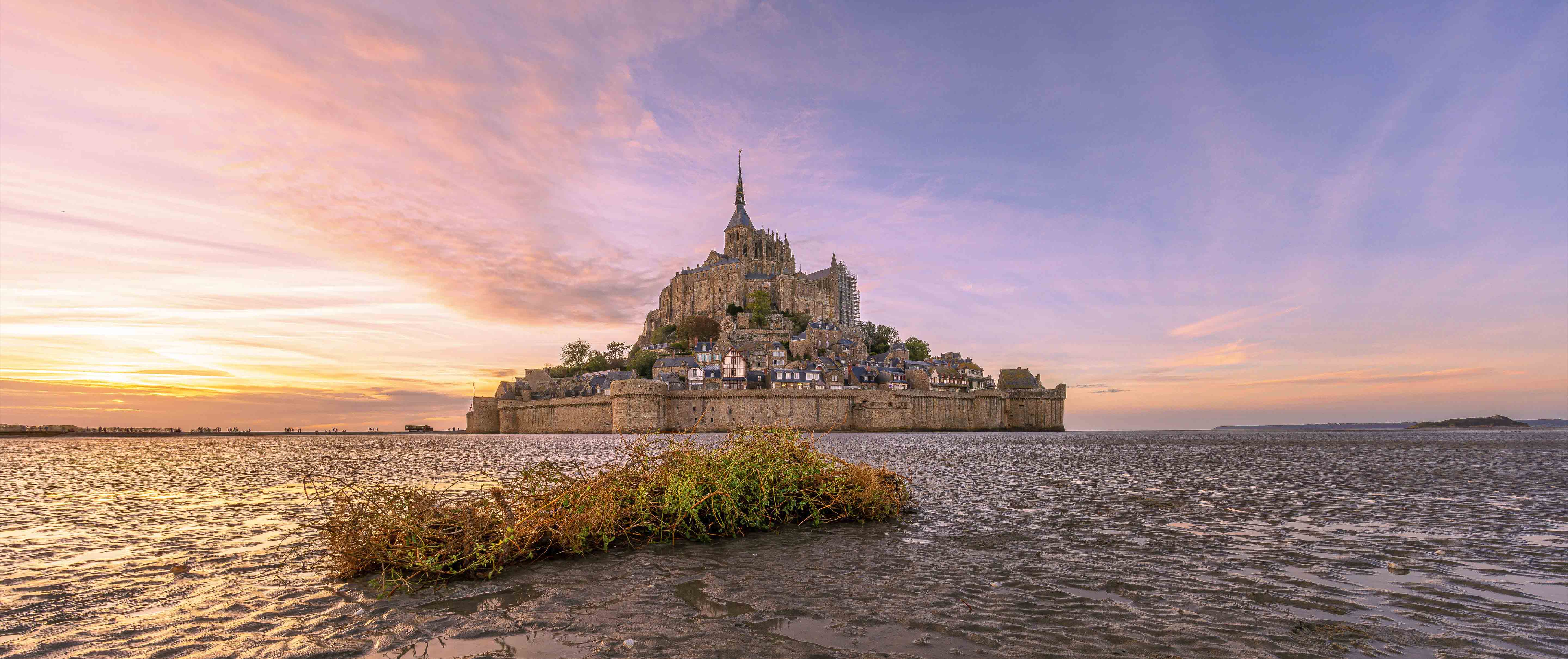 Unser nächstes Ziel ist die malerische und weltberühmte Insel bzw. Gemeinde Le Mont-Saint-Michel, die sich in der gleichnamigen Bucht im Wattenmeer der Normandie erhebt. Die Grenze zur Bretagne ist sehr nah, daher stellt sich die Frage, wo das einzigartige Bauwerk eigentlich liegt? Tatsächlich trennt der Fluss Couesnon die beiden Regionen und ordnet Le Mont-Saint-Michel eindeutig der Normandie zu. Die Insel beeindruckt schon von Weitem mit ihrer legendären Silhouette, die geprägt ist von dem mittelalterlichen Dorf und der auf dem Berg thronenden Abtei. In dieser Bucht, welche von den stärksten Gezeiten Europas geprägt ist, verwandelt sich seit 2015 der renommierte Klosterberg regelmäßig in eine buchstäbliche Insel. Da die Gemeinde inzwischen jedoch durch eine Stelzenbrücke aus Holz mit dem Festland verbunden ist, muss nur noch äußerst selten auf extreme Gezeiten geachtet werden. Heute bekommt man also nur noch ein- bis zweimal im Jahr vor Ort nasse Füße, sobald die Insel eindrucksvoll vom Meereswasser umspült wird.