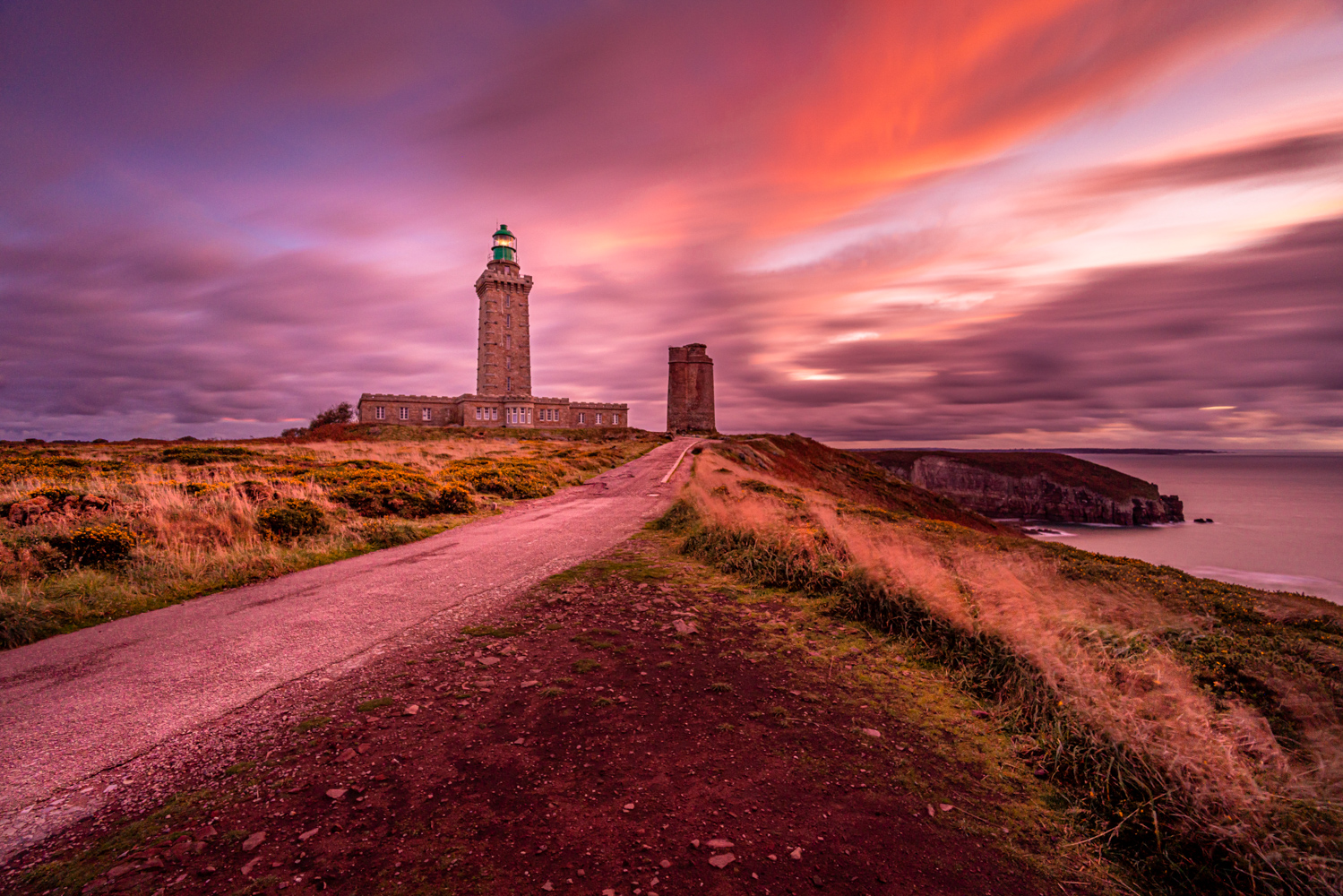 Genau hier, an der äußersten Spitze des Cap Fréhels, finden wir uns mit unseren Kameras ein – an einem Ort, der mit eindrucksvollen Klippen eines der faszinierendsten Naturdenkmäler der Bretagne darstellt. Uns erwartet eine wahrhaftige Symphonie der Farben: Über 70 Meter ragen die Klippen majestätisch über dem türkisfarbenen Meer empor, bestehend aus schwarzglänzendem Schiefer, rosafarbenem Sandstein und lebhaft orangefarbenem Granit. Diese Formationen bieten eine der bezauberndsten Aussichten in der gesamten Region.