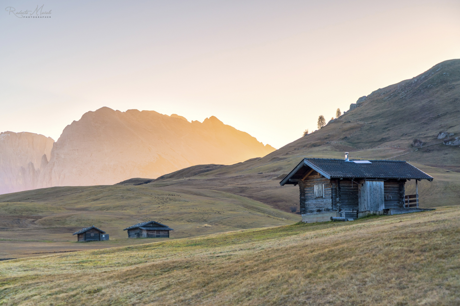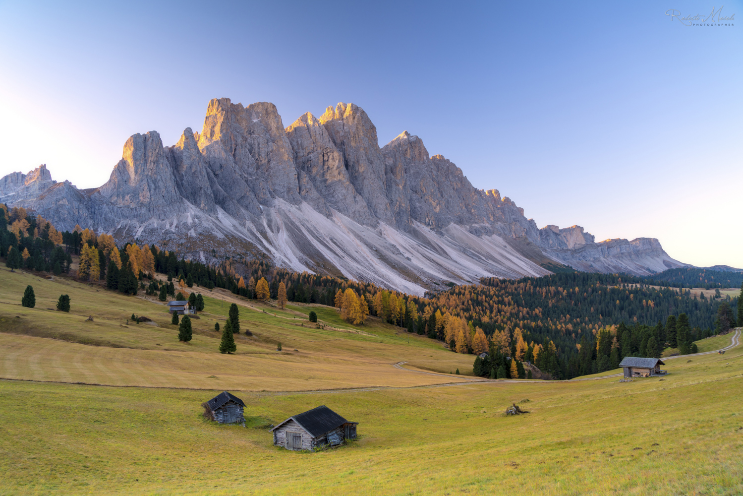 Heute stehen wir schon sehr früh auf, um uns die Lichtstimmungen über der Geisler-Kette zum Sonnenaufgang nicht entgehen zu lassen. Nach einer ausgiebigen Fotosession am frühen Morgen haben wir uns ein leckeres Frühstück im Hotel verdient. Und bald ist es an der Zeit, einen der idyllischsten Orte dieser Reise zu fotografieren – die Seiser Alm. Hier erwartet uns eine ganz besondere Atmosphäre: die Luft ist klarer, die Farben des Herbstes noch intensiver, flüsternde Bäche, scheue Tiere und die endlos scheinende Weite verleihen diesem Ort eine wohltuenden Stille - so etwas gibt es kaum noch einmal in Europa. Wir fotografieren die reizvolle Landschaft voller farblicher Kontraste, mit ihren typischen Berghütten, sanften Almwiesen, den prächtig gefärbten Bäumen vor einem bizarren Dolomiten-Panorama, welches von der warmen Sonne in ein weiches Licht getaucht wird.
