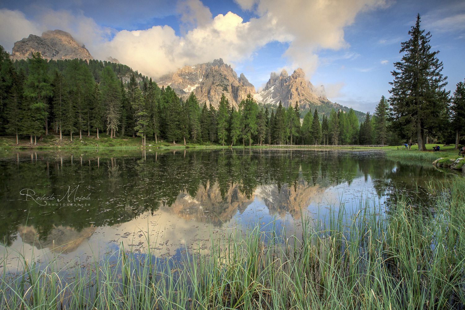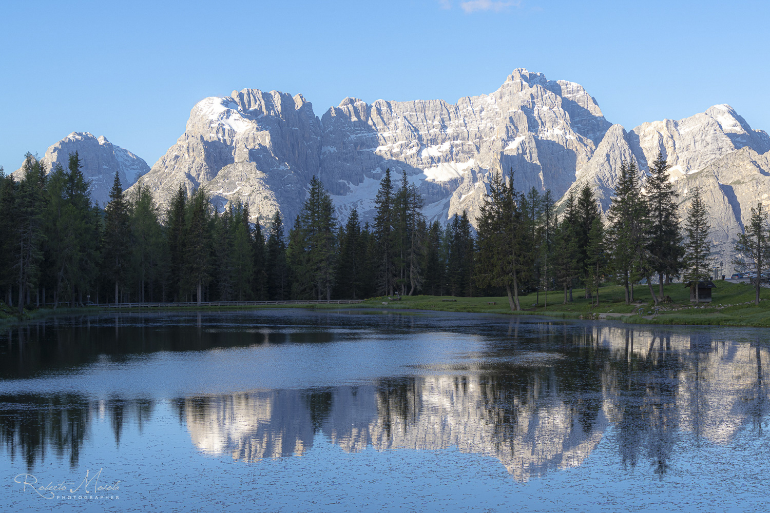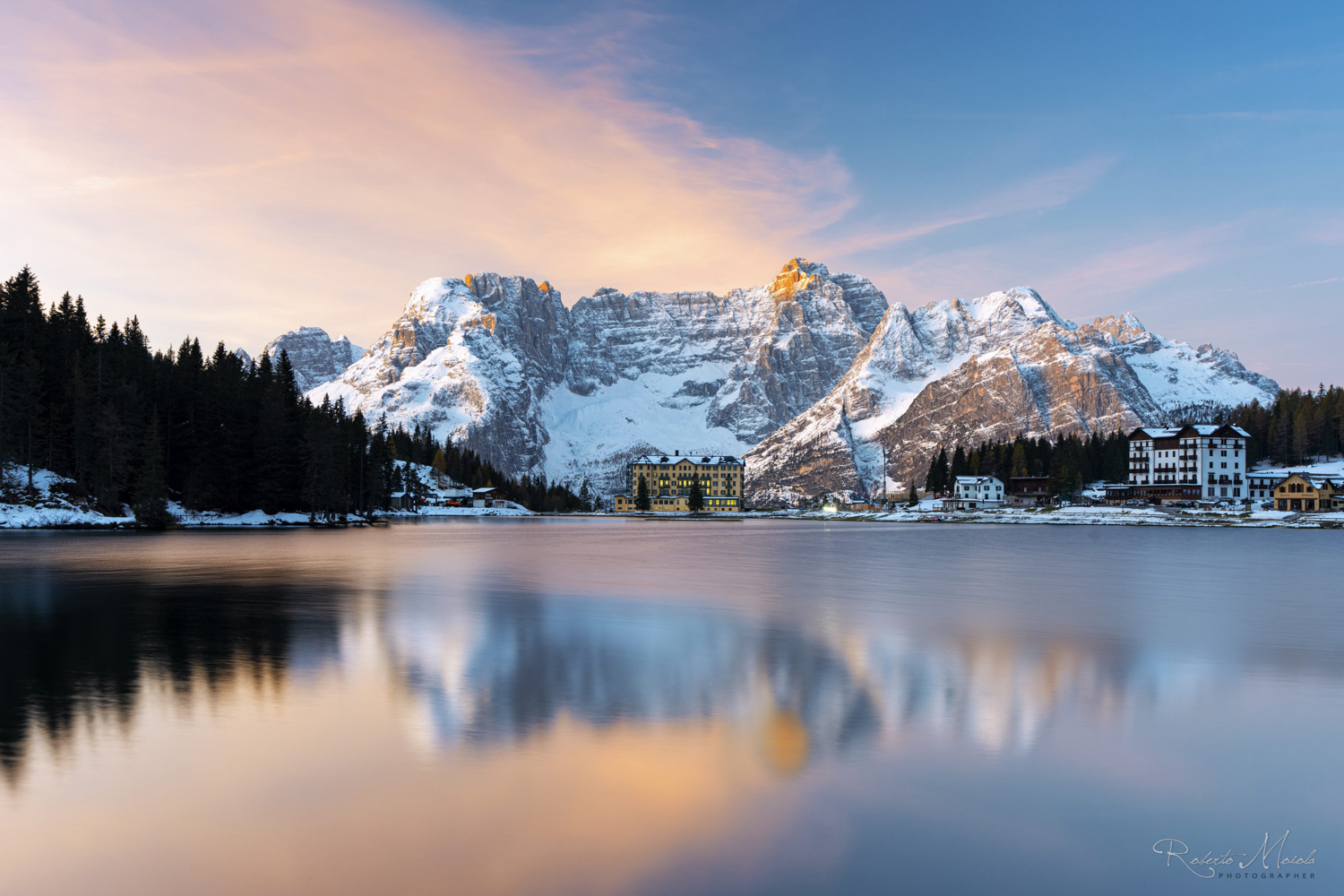 Und wieder heißt es heute: „Früh Aufstehen!“, denn unser nächstes Ziel, den malerischen Lago di Misurina, erreichen wir nur rechtzeitig vor Sonnenaufgang, wenn wir uns schon im Dunkeln auf den Weg machen. So verbringen wir den Sonnenaufgang am Ufer des berühmten Misurina-Sees (1.756 m ü.M.) und fotografieren die Sorapiss-Berggruppe mit ihren Spiegelungen im Wasser noch bevor die erste Morgenbrise den See aufwühlt. Umgeben von üppigen, dunklen Wäldern ruht der Lago di Misurina wie ein silbrig schimmernder Spiegel in der unberührten Berglandschaft. Aufgrund seines klaren Wassers und der mächtigen Bergkulisse im Hintergrund, wird der See auch gerne als „Perle des Cadore“ bezeichnet. Wir halten den Anblick dieses irdischen Paradieses in unseren Bildern fest und schauen in der Ferne bereits auf das, was uns bald erwartet: die legendären Drei Zinnen des Lavaredo - Wahrzeichen der (Sextner) Dolomiten.