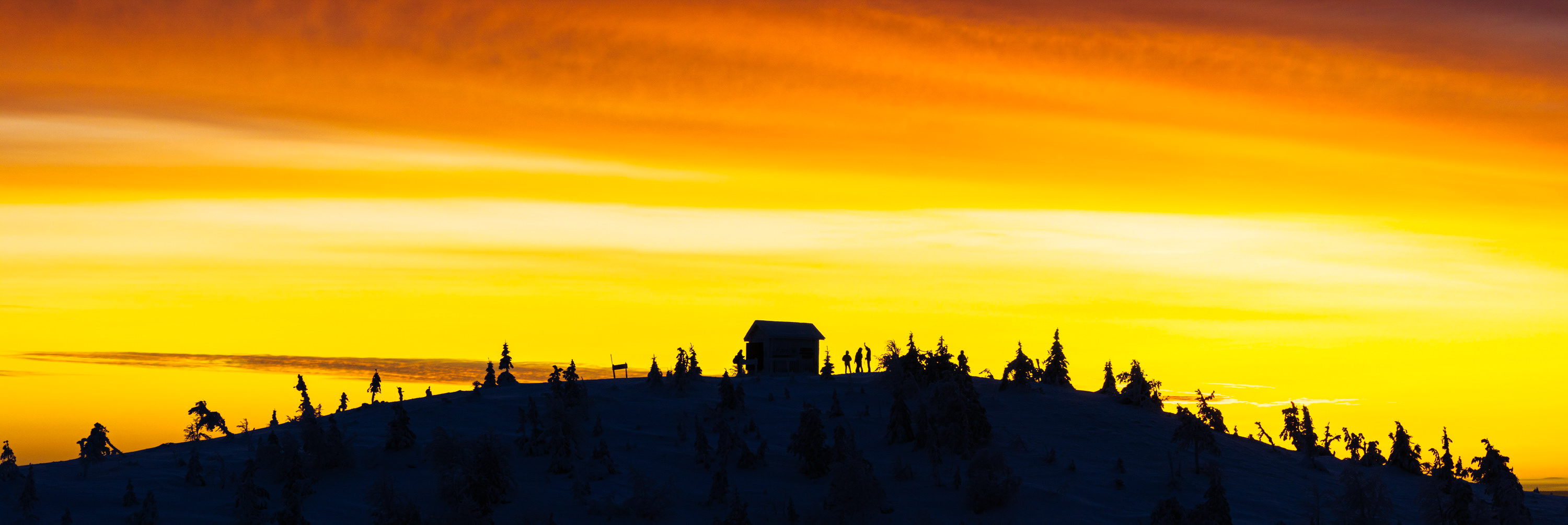 Am Abend steht bereits das nächste Highlight auf unserem Tourplan - der mit 492 m ü. M. höchste Gipfel der Gegend. Über verschneiten Waldseen, alten Kiefern- und Birkenbestand spuren wir zum baumlosen Gipfel, der eine grandiose Rundumsicht bietet. In seinem winterlichen weißen Kleid ist er eine wahre Schönheit und gleichzeitig ein ausgezeichneter Ort, um den Sonnenuntergang und vielleicht auch tanzende Polarlichter einzufangen.