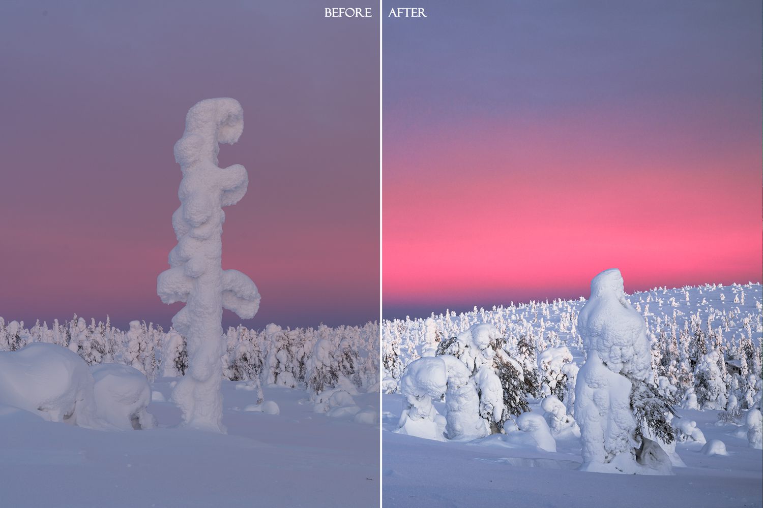- Sunset-Shooting im Winter Wonderland, atemberaubende Ausblicke und weiße Fjäll-Landschaften im magischen Licht des finnischen Winters