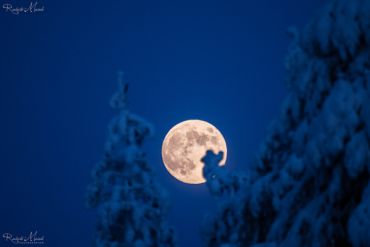 Um für unseren "Abend-Ausflug“ gerüstet zu sein, ist es Zeit, Energie und vor allem viel Wärme zu tanken. Der Vollmond erhebt sich bereits majestätisch über der verschneiten Landschaft und taucht sie in ein sanftes silbernes Licht. Es ist die perfekte Kulisse für eine Foto-Nachtwanderung. Mit Stirnlampen ausgerüstet, begeben wir uns in die Stille der Nacht. Die Landschaft um uns herum ist in ein glitzerndes Licht getaucht, doch wir können die Konturen der Bäume und Hügel deutlich sehen. Unsere Kameras sind bereit, das faszinierende Spiel von Licht und Schatten einzufangen, welches der Vollmond über die Landschaft zaubert. Wir halten inne, um die Schönheit dieser epischen Szenerie zu erfassen und für immer in unseren Bildern festzuhalten.