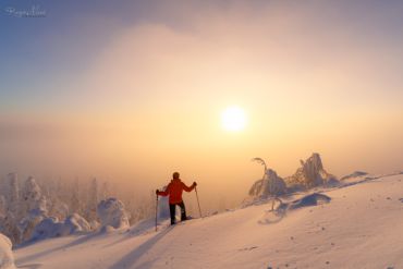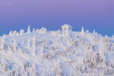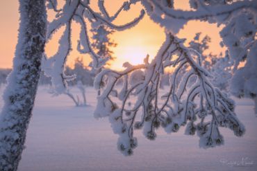 Es ist wieder sehr früh am Morgen, das Thermometer im finnischen Lappland zeigt starke Minusgrade, die Luft riecht nach Kälte & Schnee und ist zugleich unfassbar rein. Unser heutiges Ziel: einer der markantesten Berge in der Region Nordösterbotten im Nordosten Finnlands. Beeidruckende 432 Meter ragt er über den Meeresspiegel und bietet daher eine hervorragende Aussicht auf die umliegende Landschaft. Auf unserer ausgedehnten Schneeschuh-Fotowanderung durch die reinste Luft Nordeuropas begegnen wir märchenhaften Motiven. Der Schnee hat die Landschaft entlang der hügeligen Fjällkette überdeckt als hätte jemand Sahne aus dem Himmel darüber gegossen – ein weißer Teppich, der alles zudeckt und neue, bizarre Formationen hervor gebracht hat. Wir können uns kaum sattsehen und fotografieren zum Sonnenaufgang eine unaufgeregte Landschaft, die uns unmerklich verzaubert und tief durchatmen lässt.