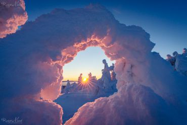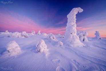 Es ist wieder sehr früh am Morgen, das Thermometer im finnischen Lappland zeigt starke Minusgrade, die Luft riecht nach Kälte & Schnee und ist zugleich unfassbar rein. Unser heutiges Ziel: einer der markantesten Berge in der Region Nordösterbotten im Nordosten Finnlands. Beeindruckende 432 Meter ragt er über den Meeresspiegel und bietet daher eine hervorragende Aussicht auf die umliegende Landschaft. Auf unserer ausgedehnten Schneeschuh-Fotowanderung durch die reinste Luft Nordeuropas begegnen wir märchenhaften Motiven. Der Schnee hat die Landschaft entlang der hügeligen Fjällkette überdeckt als hätte jemand Sahne aus dem Himmel darüber gegossen – ein weißer Teppich, der alles zudeckt und neue, bizarre Formationen hervor gebracht hat. Wir können uns kaum sattsehen und fotografieren zum Sonnenaufgang eine unaufgeregte Landschaft, die uns unmerklich verzaubert und tief durchatmen lässt.
