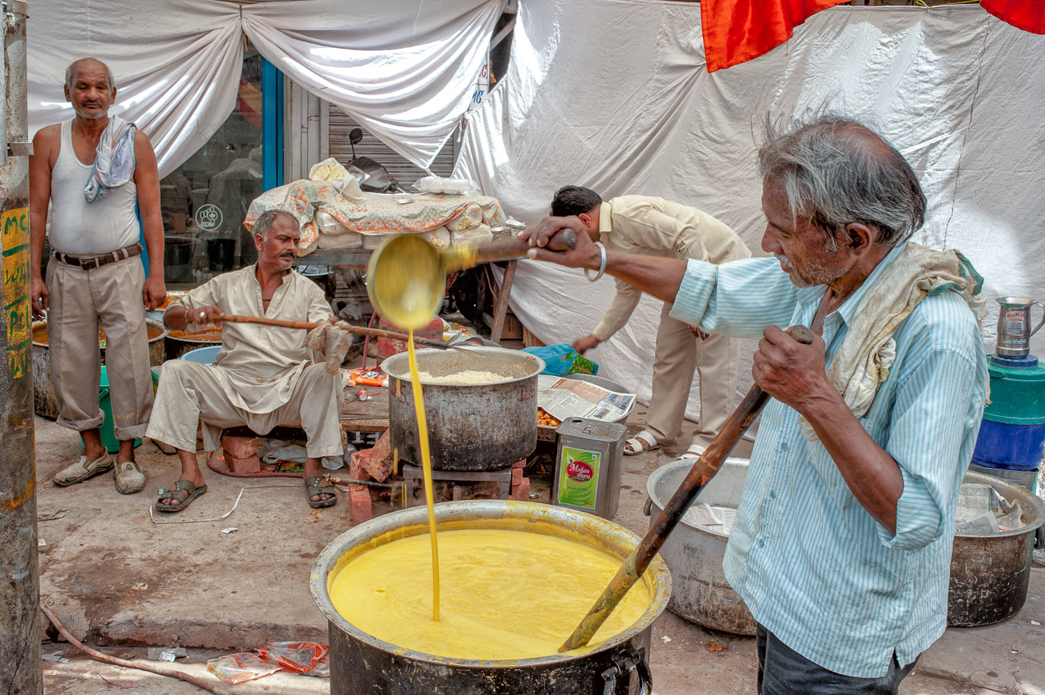 Wir beginnen unsere Fototour auf einem Gemüsemarkt, den es bereits im 17. Jahrhundert gab und bis heute voller Leben steckt. Auf unserem Weg fotografieren wir das faszinierende Panorama über die Dächer der Altstadt und legen einen Stop am berühmten Jalebiwala, einem jahrhundertealten Süßigkeitenladen an der Ecke Chandni Chowk ein, in dem wir die leckeren klebrigen Jalebis (frittierte sirupartige "Schnörkel") probieren können. Der farbenfrohe Markt Chandni Chowk ist das Handelszentrum von Old Delhi. Der Basar entlang Dariba Kalan Road lädt zum Einkaufen von Gold-, Silber oder Modeschmuck ein, währenddessen auf dem Kinari Basar glitzerndes Lametta, Dekorationen und andere kunstvolle Braut- und Hochzeitsaccessoires gehandelt werden. Anschließend fahren wir zur Paranthe Wali Gali - eine Straße, auf der sich viele kleine Restaurants befinden, die sich auf Parathas (indisches Fladenbrot) spezialisiert haben. Wir beobachten die Einheimischen in ihrem täglichen Leben - einen besseren Spielplatz für Streetfotografie und das Portraitieren fremder Kulturen können wir uns nicht wünschen, denn die Inder sind neugierig, hilfsbereit und versessen darauf, fotografiert zu werden. Unbezahlbare Eindrücke vom Alltag der Menschen Indiens und ein Fest der Sinne für jeden Fotografen.