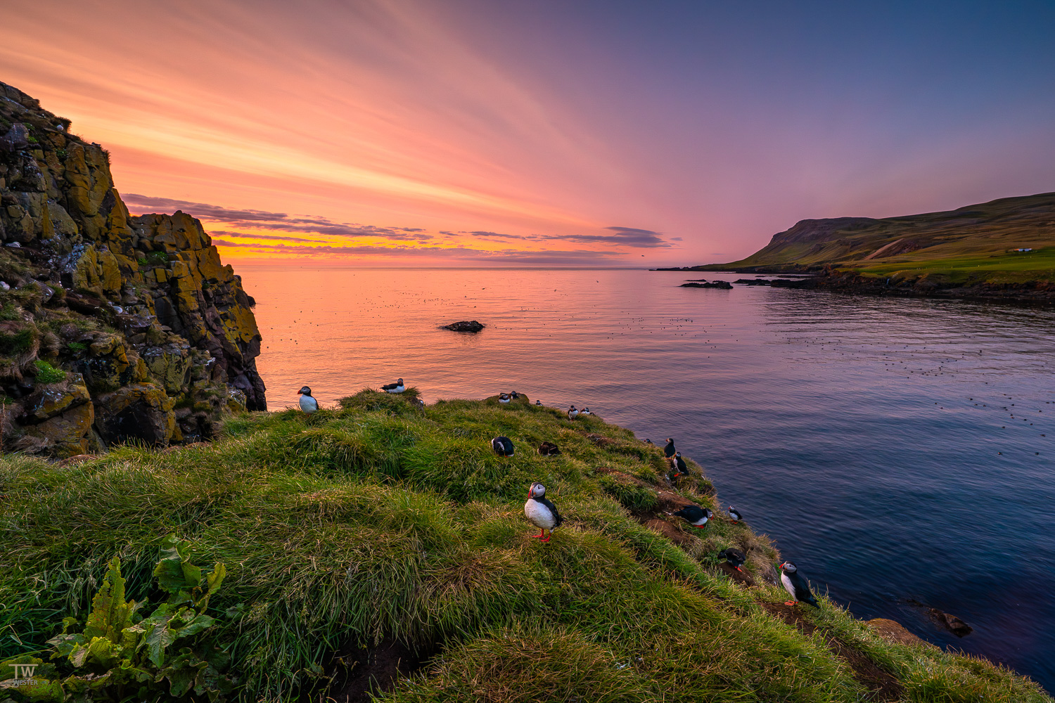 Die markanten Basaltfelsen sind das Ergebnis vulkanischer Aktivitäten und jahrhundertelanger Erosion durch das tosende Wellenspiel. Wir nutzen die Chance, die zerklüfteten Formationen aus verschiedenen Blickwinkeln einzufangen und die kraftvolle Energie der Natur zu spüren. Auf der anderen Seite der Felsenküste kommen wir in den Genuss eines weiteren Naturwunders: die frei im Ozean stehende, fast 60 Meter hohe Klippe Karlinn, auch bekannt als „The Giantess". Sie erhebt sich stolz über dem Meer und präsentiert eine markante Silhouette, die an eine schlafende Riesin erinnert. Besonders im weichen Licht der Sommernacht entfalten sowohl die Felsen von Valahnúkamöl als auch die Klippe Karlinn ihre volle Schönheit. Es taucht die Vulkanlandschaft in einen magischen Glanz und lässt die Konturen und Details eindrucksvoll zur Geltung kommen. Wir machen uns das zu Nutze und fangen mit unseren Kameras das fotogene Spiel von Licht und Schatten ein. Nach dieser ereignisreichen Nacht kehren wir zu unserer nahegelegenen Unterkunft zurück und tanken neue Energie für den nächsten Tag.