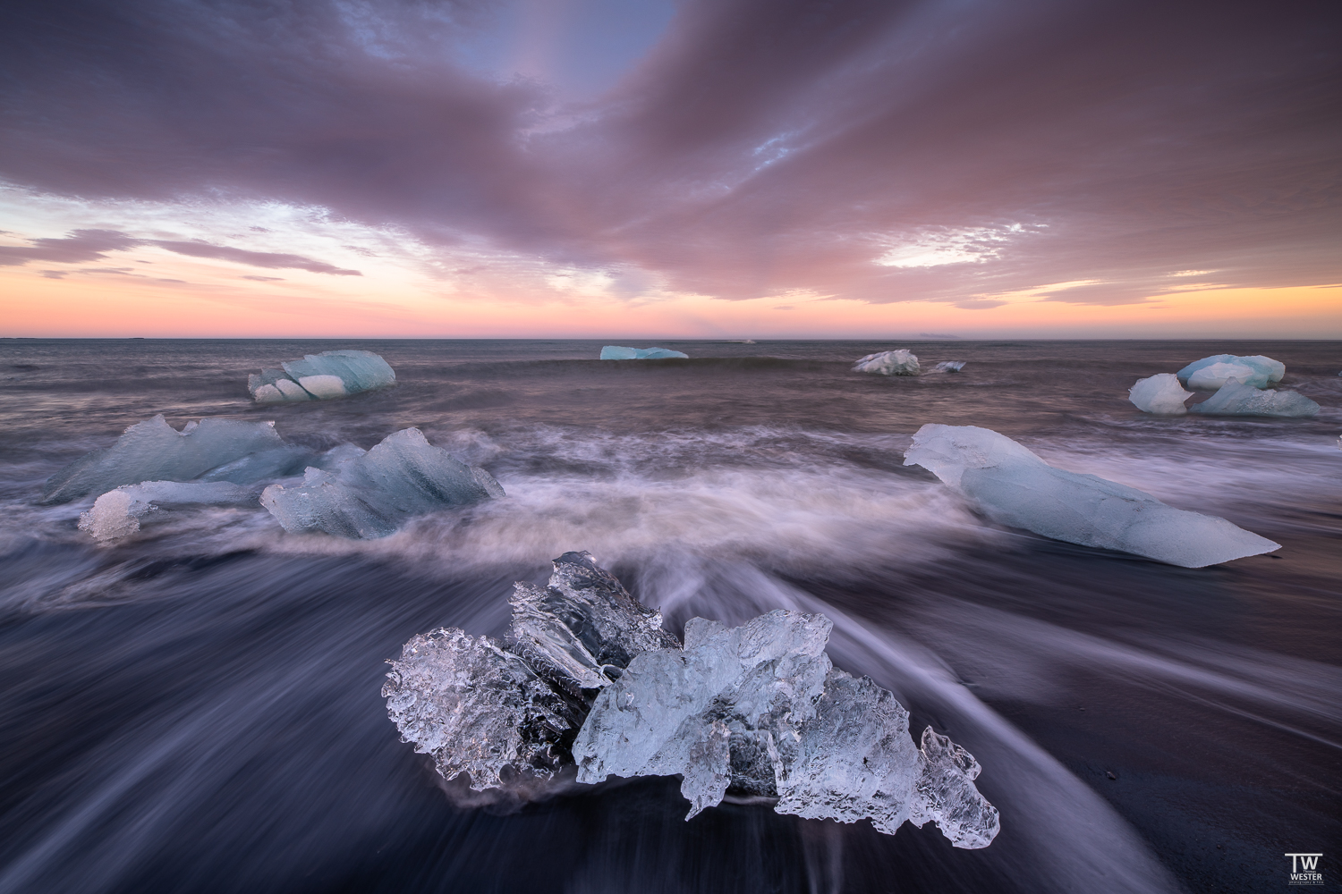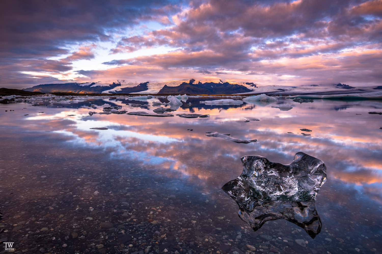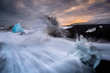 Der Gletschersee erstreckt sich über eine Fläche von etwa 18 Quadratkilometern und ist mit einer Tiefe von bis zu 248 Metern der tiefste See Islands. Vom trockenen Ufer aus werden wir die im Wasser schwimmenden Eisblöcke und -schollen fotografisch einfangen. Die unterschiedlichen Größen und Formen der Eisskulpturen bieten uns zahlreiche Möglichkeiten einer ausdrucksstarken Bildkomposition – besonders spektakulär im Licht der tief stehenden Sonne. Ein außergewöhnlich schönes Schauspiel sind die im Wasser spielenden Robben, die sich neugierig dem Ufer nähern und uns dabei zuschauen, wie wir die Landschaft mit unseren Kameras einfangen. Auch auf dem sogenannten „Diamond Beach“ finden wir mit etwas Glück die ein oder anderen Eis-Diamanten. Er befindet sich in unmittelbarer Nähe des Jökulsárlón-Gletschersees. Nach unserem nächtlichen Abenteuer im „ewigen Eis“ Islands steuern wir wieder unser Hotel an und verabschieden uns in die Nacht bis zum morgigen Tag.
