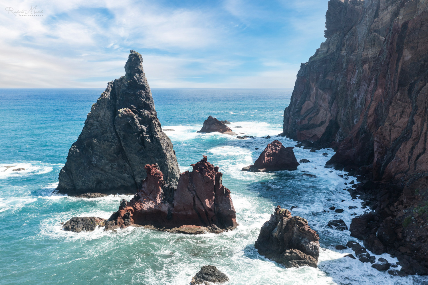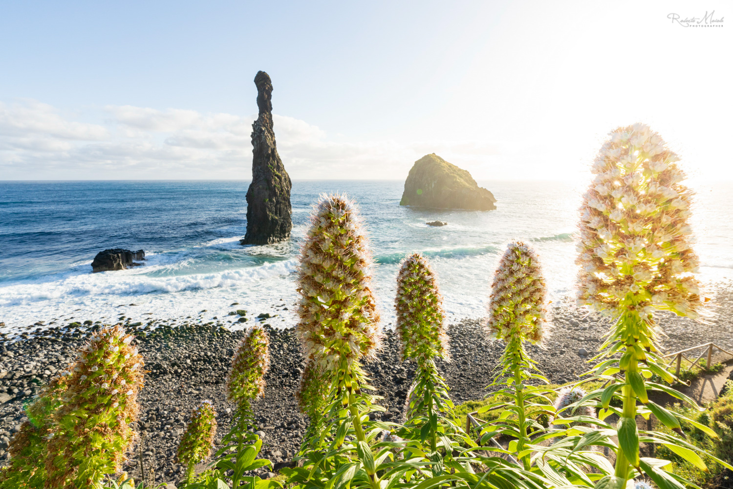 Unser erster Sonnenaufgangs-Spot liegt im Nordwesten von Madeira zwischen dem Städtchen Seixal und Porto Moniz. Schon von Weitem erkennen wir die markanten Lavafelsen Ilheus da Rib und Ilheus da Jenela, die wie Nadeln aus dem Wasser ragen. Sobald der Horizont durch die aufgehende Sonne zu glühen beginnt, fotografieren wir die bizarren Felsformationen vor der zerklüfteten Küstenlinie mit ihren heftigen Wellen, welche uns die Kraft des Ozeans förmlich spüren lassen. Auf der Suche nach der besten Bildkomposition experimentieren wir mit langen und kurzen Verschlußzeiten oder auch mit Luftaufnahmen, um diesen epischen Ort an der wilden Nordküste stimmungsvoll in Szene zu setzen. Nach unserer Rückfahrt ins Hotel bleibt ausreichend Zeit, Kräfte zu sammeln, um frisch gestärkt unsere nächste Foto-Session anzutreten.