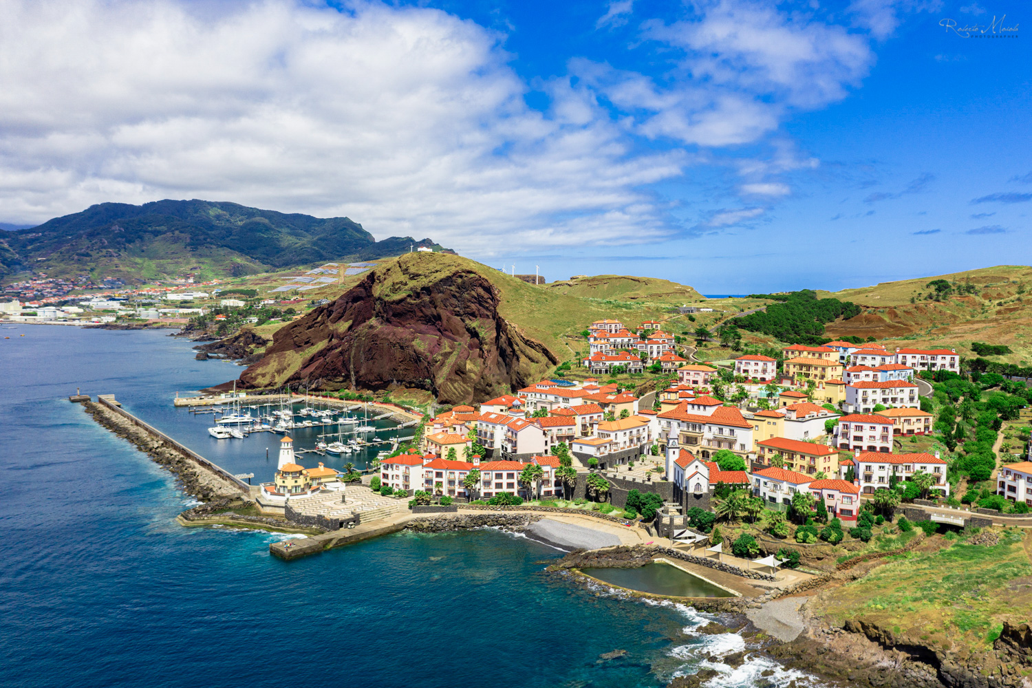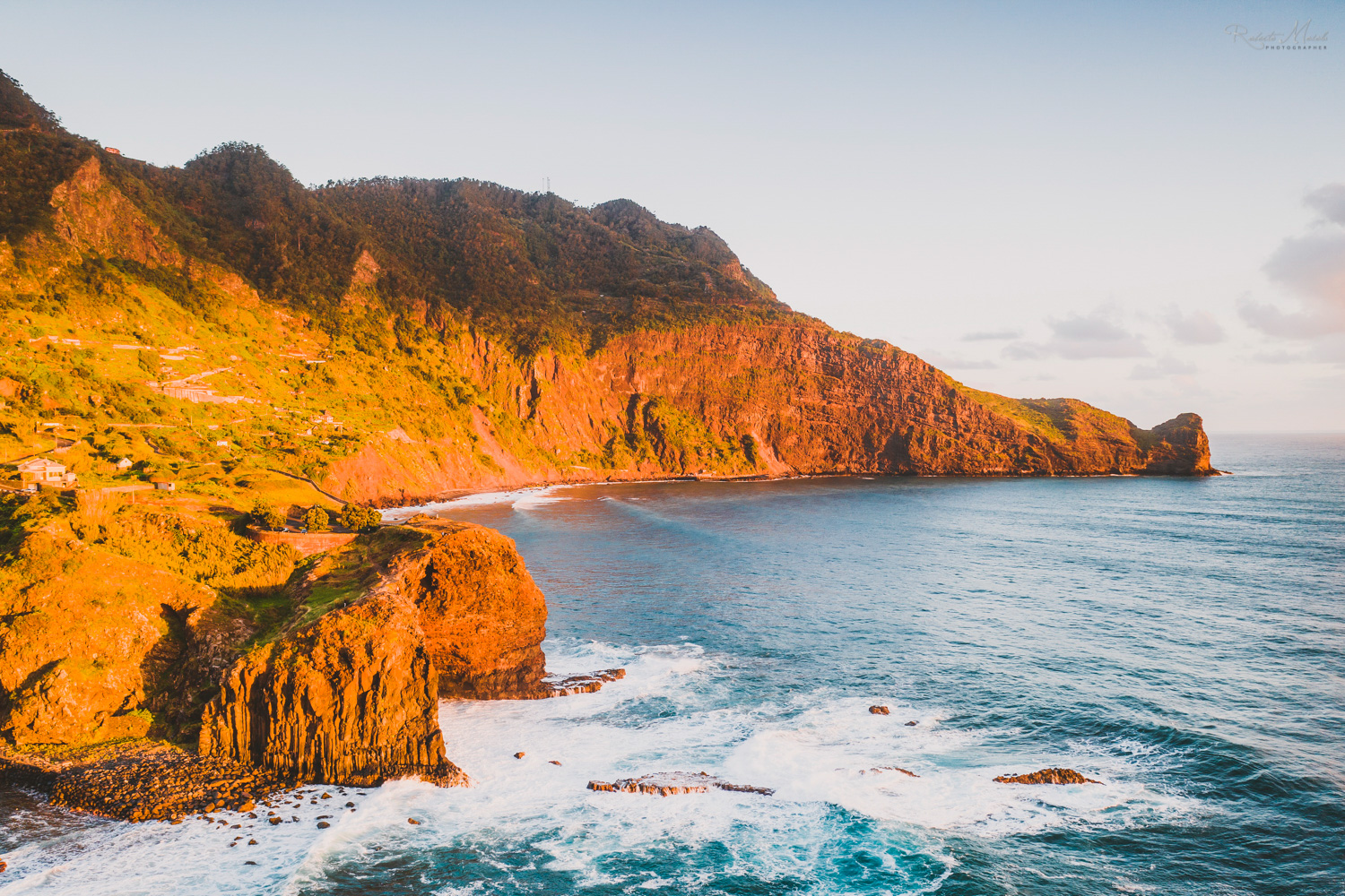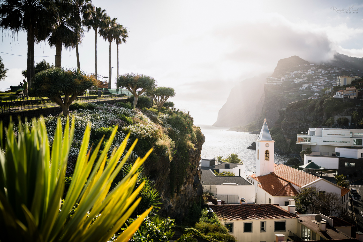 Nach einer epischen Sonnenaufgangs-Session in der nahen Umgebung und einem letzten Frühstück in unserem Hotel in Porto Moniz ist es Zeit, unsere Basis für die verbleibenden Tage an die Südküste Madeira’s zu verlagern. Auf unserem Roadtrip erkunden wir fotografisch Ponta do Pargo, die am westlichsten gelegene Gemeinde Madeiras. Schon von Weitem erblicken wir einen Leuchtturm, wie er auf den schroffen Atlantik-Klippen thront. Schwindelfrei sollten wir sein, denn links und rechts geht es 312 Meter in die Tiefe. Damit ist Ponta do Pargo das höchstgelegene Signalfeuer Portugals, welches im Sekundentakt drei weiße Lichtblitze etwa 80 Meilen hinaus auf‘s Meer schickt. Fast könnte man meinen, der Leuchtturm flirtet ein bisschen mit dem Meer, statt die Seefahrer zu warnen. Vor uns liegt eine Traumkulisse mit atemberaubenden Ausblicken auf den Ozean und zugleich tollen Möglichkeiten für Luftaufnahmen. Anschließend setzen wir unsere Reise in Richtung Jardim do Mar, einem malerischen Örtchen an der Westküste der Insel, fort. Die pittoreske Lage des kleinen Städtchens bietet spektakuläre Ausblicke auf das tiefblaue Meer, welches sich an imposanten Felsen bricht – eine majestätische Naturkulisse für uns Fotografen. So halten wir die Essenz des Ortes mit unseren Kameras fest und fokussieren uns auf die vielfältigen Details der malerischen Kleinstadt, welche von engen Gassen und charakteristischen niedrigen Häuserzeilen mit roten Ziegeldächern und weißen Wänden, umgeben von blühenden Bougainvillea und anderen tropischen Pflanzen, geprägt ist.