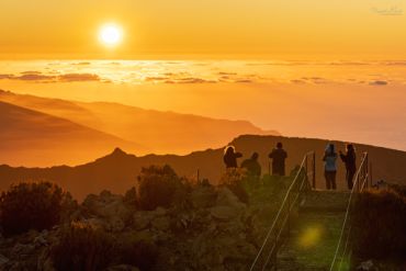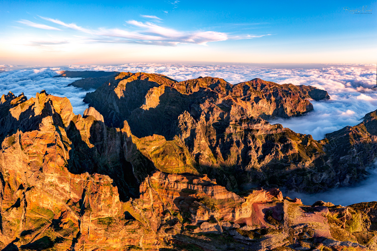 Unser Sonnenuntergangs-Ziel heißt heute Pico Ruivo - mit 1.862 m ü.M. der höchste Berg der Insel - wir sind also im wahrsten Sinne des Wortes auf dem „Dach Madeiras unterwegs“. Der Weg zum Gipfel ist anspruchsvoll und fordert unsere Fitness heraus. Doch jeder Schritt auf dem gut gesicherten Pfad lohnt sich, denn immer wieder werden wir von unglaublichen Panoramen überrascht. Während wir uns dem Gipfel nähern, beginnt die Sonne langsam den Himmel in warme Farben zu tauchen. Die Wolken unter uns verwandeln sich in ein goldenes Meer, das im Licht des Sonnenuntergangs glitzert und schimmert. Wir halten inne, um diese magischen Momente zu genießen und fotografisch festzuhalten. Mit etwas Glück erleben wir das atemberaubende Schauspiel der Nebelschwaden, welche wie Geister über die Landschaft ziehen und die umliegenden Gipfel in mystische Silhouetten verwandeln. Oben angekommen, sind wir überwältigt von der grandiosen Aussicht. Die umliegenden Gipfel der Zentralgebirge ragen majestätisch in den Himmel, während sich unter uns das Land bis zum Horizont erstreckt. Wir fühlen uns wie auf einer Bühne, auf der die Natur ein episches Drama aus Licht und Schatten aufführt.