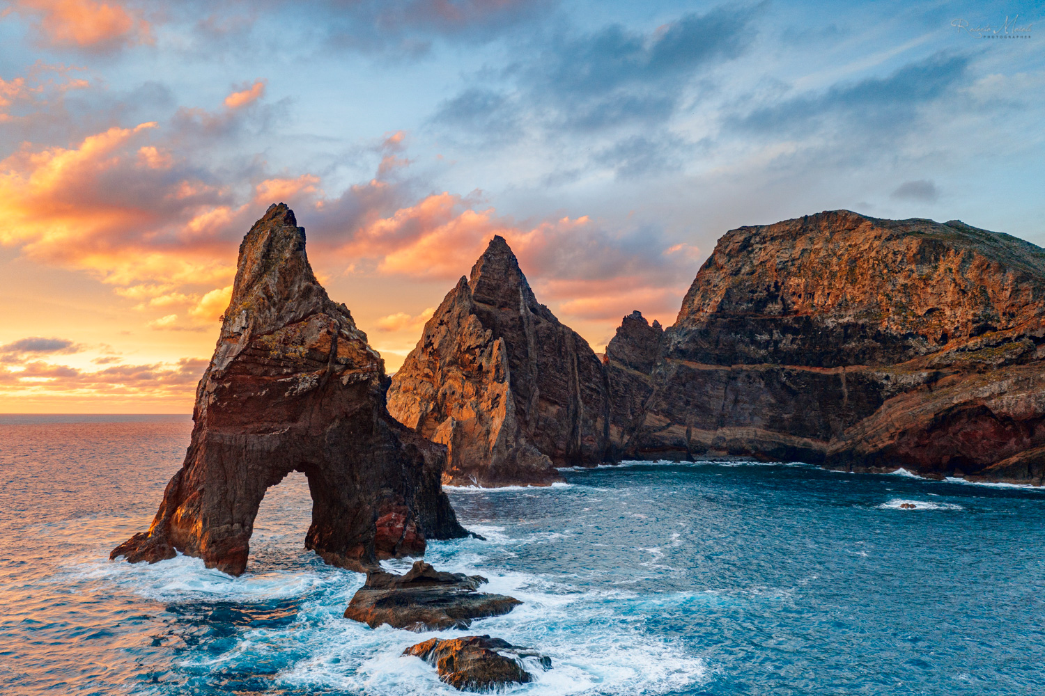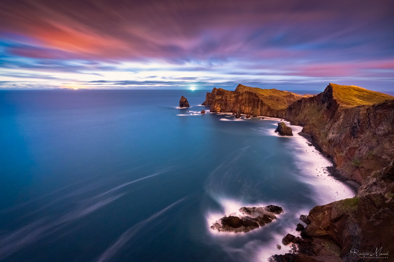 Langsam neigt sich der letzte Tag unserer unvergesslichen Fotoreise dem Ende zu. Die bevorstehende Sunset-Foto-Session am Ponta do Rosto bietet uns die letzte Gelegenheit, die atemberaubende Schönheit und den Zauber Madeiras in vollen Zügen zu genießen und noch einmal intensiv auf uns wirken zu lassen. Der Miradouro da Ponta do Rosto, ein Aussichtspunkt, der auf der zum Naturdenkmal erklärten Halbinsel São Lourenço liegt, bietet eine seltene Besonderheit: Von hier aus können wir sowohl die Nord- als auch die Südküste der Insel Madeira sehen. Diese einzigartige Perspektive lässt uns die dramatischen Kontraste der Insellandschaft in ihrer vollen Pracht erleben. Die steilen Küstenklippen, die sich majestätisch aus dem Meer erheben, bieten eine malerische Kulisse, die von der Natur selbst geschaffen wurde. Während die Sonne langsam Richtung Horizont sinkt, taucht sie die Landschaft in ein warmes, goldenes Licht. Die Farben des Himmels verwandeln sich in ein Kaleidoskop aus Orange, Rosa und Violett, das die steilen Klippen und das sanft bewegte Meer in ein magisches Licht hüllt. Die Wellen brechen sanft gegen die Felsen und erzeugen ein beruhigendes Rauschen, das die friedliche Atmosphäre verstärkt.