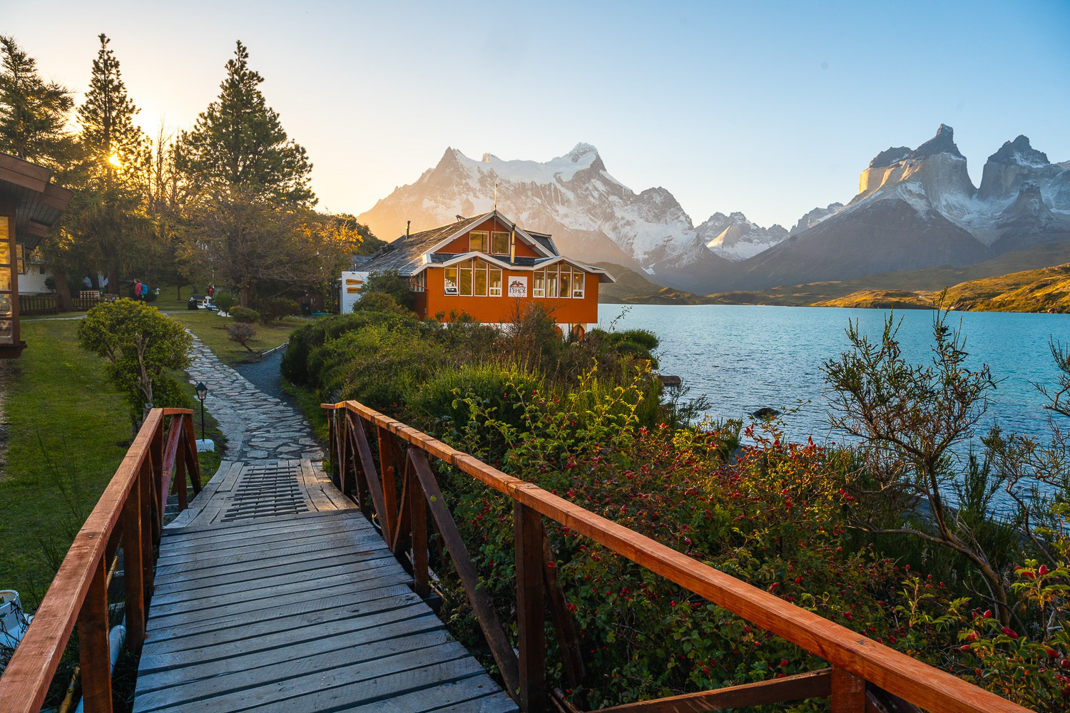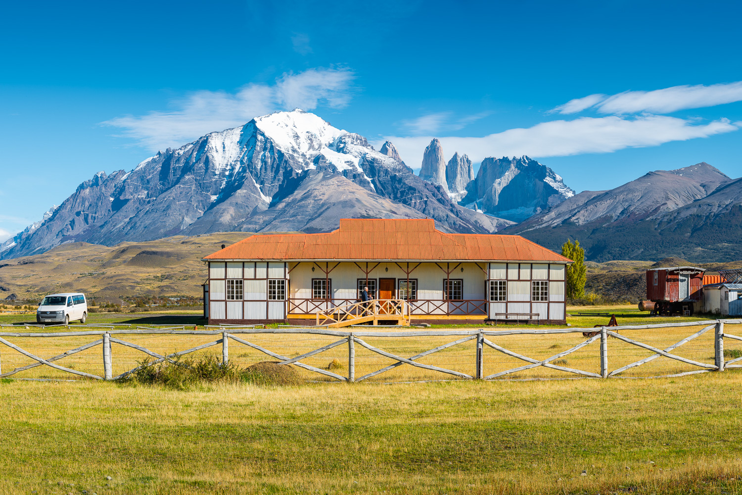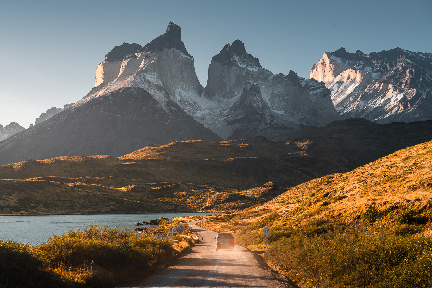 Und obwohl gerade deshalb unsere Vorfreude bereits ins Unermessliche steigt, legen wir nach einer ca. dreistündigen Fahrt in Puerto Natales – der letzten Stadt vor Einfahrt in den Nationalpark – eine kleine Pause ein. Wir essen dort gemütlich zu Mittag, füllen in Ruhe die Tanks für die bevorstehende Tour auf und treffen die letzten Vorkehrungen für die nächsten Tage. Und dann tauchen wir ein: in die beeindruckende Welt des Torres del Paine Nationalparks. Unser gemütliches Hotel, das einen unvergesslichen Ausblick auf die umliegende Berglandschaft bietet, erreichen wir am Nachmittag. Von einem Aussichtspunkt in der Nähe des Hotels haben wir einen ersten fantastischen Blick auf die spitzen Granittürme des Paine-Massivs und können uns darauf freuen, diese Berglandschaft in den kommenden Tagen von verschiedenen Standorten und zu unterschiedlichen Tageszeiten fotografieren zu können. Wir genießen im Hotel ein köstliches chilenisches Abendessen und erholen uns von der heutigen Anfahrt.