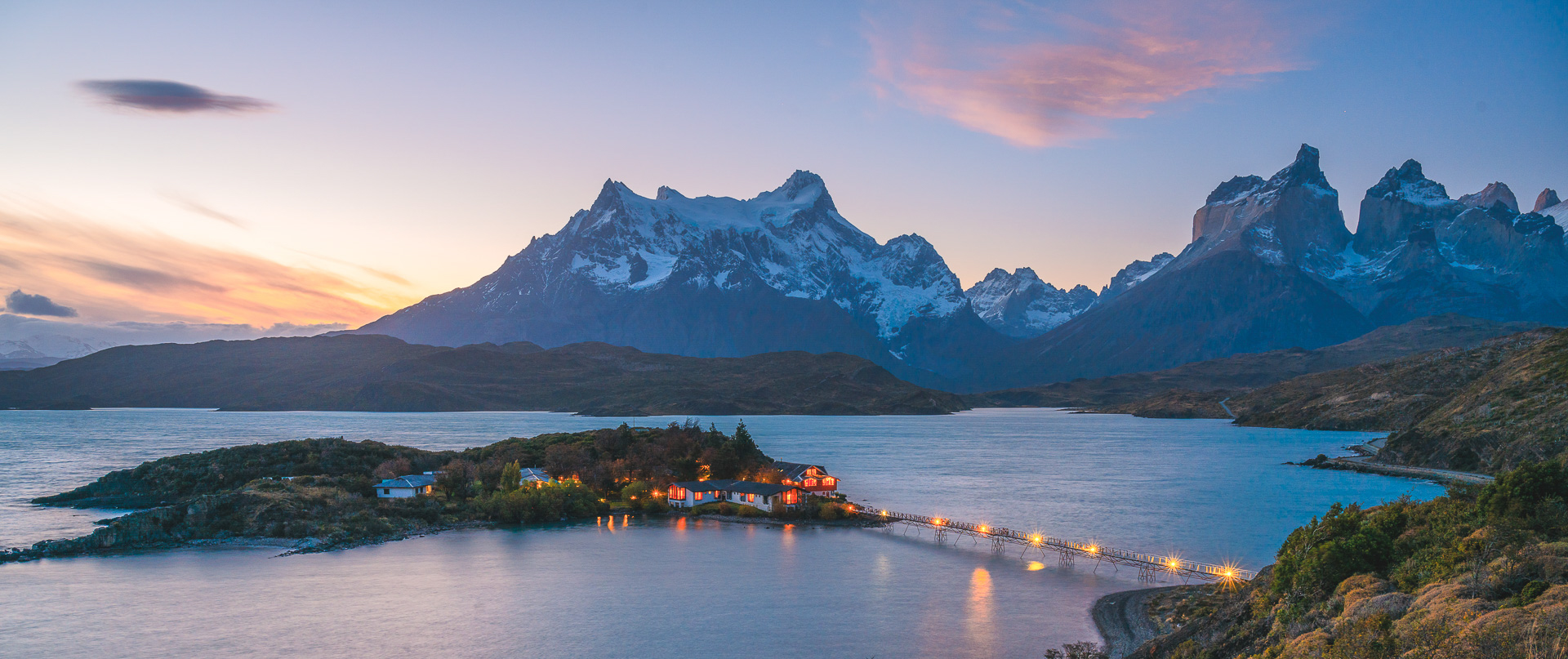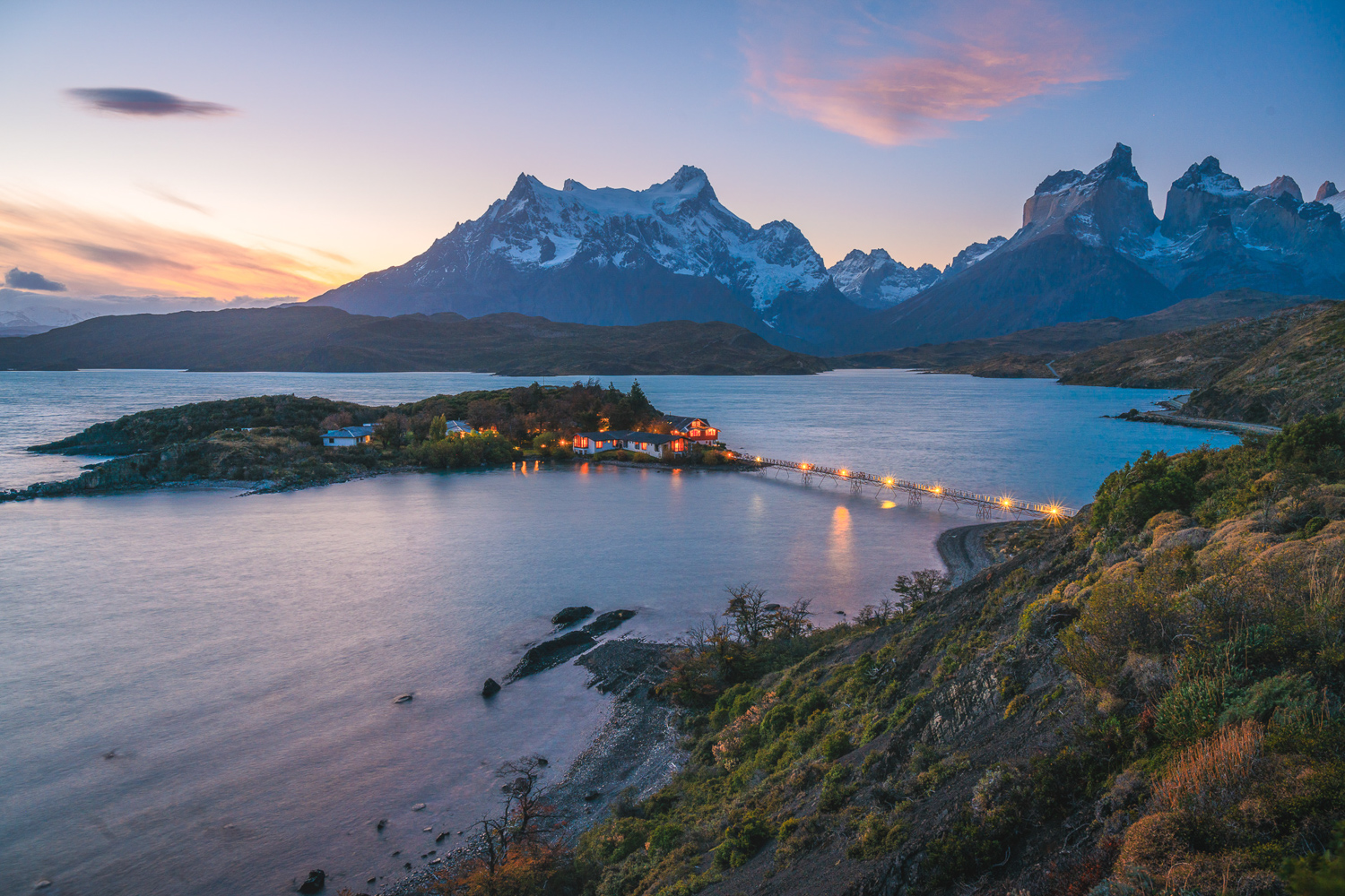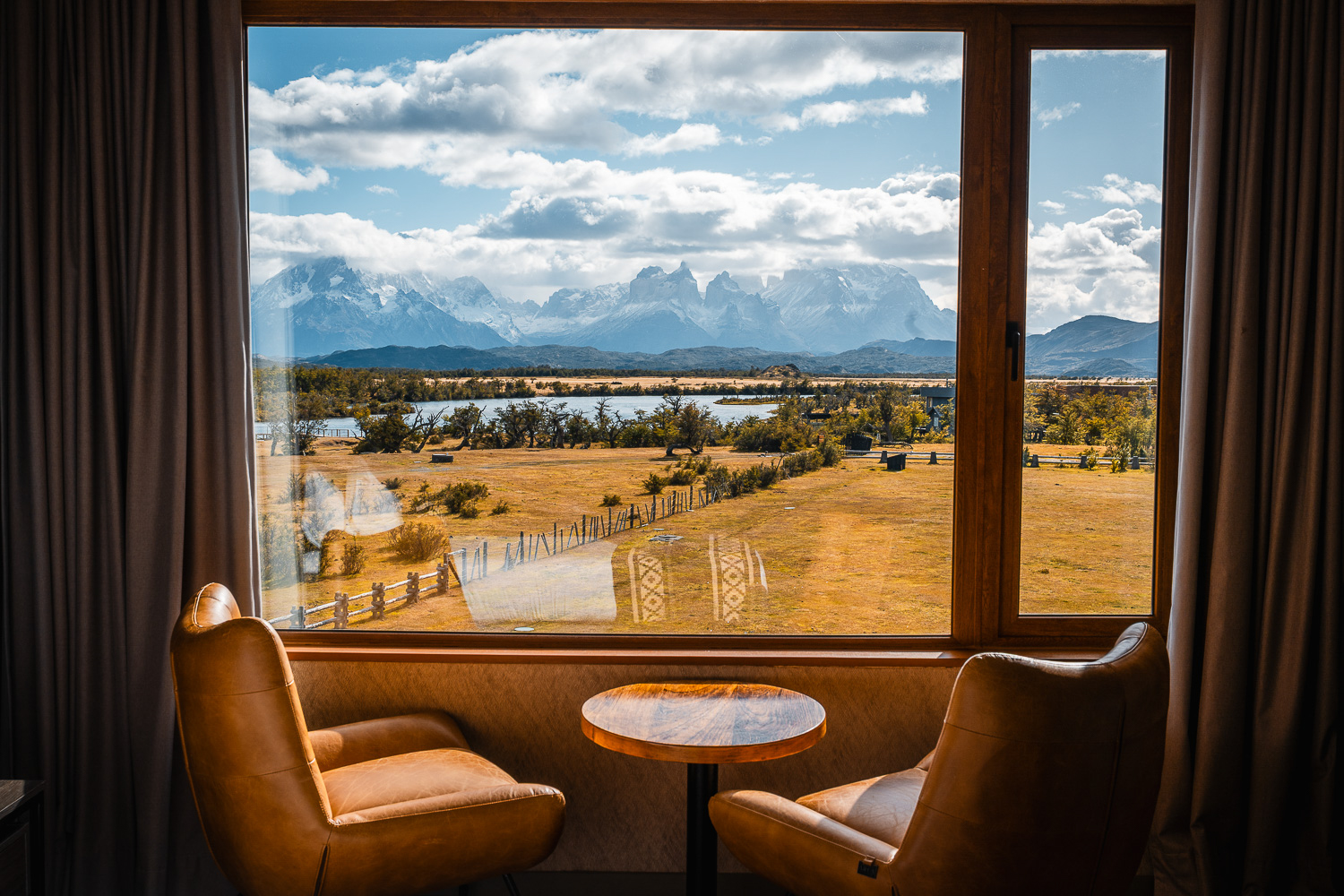 Und obwohl gerade deshalb unsere Vorfreude bereits ins Unermessliche steigt, legen wir nach einer ca. dreistündigen Fahrt in Puerto Natales – der letzten Stadt vor Einfahrt in den Nationalpark – eine kleine Pause ein. Wir essen dort gemütlich zu Mittag, füllen in Ruhe die Tanks für die bevorstehende Tour auf und treffen die letzten Vorkehrungen für die nächsten Tage. Und dann tauchen wir ein: in die beeindruckende Welt des Torres del Paine Nationalparks. Unser gemütliches Hotel, das einen unvergesslichen Ausblick auf die umliegende Berglandschaft bietet, erreichen wir am Nachmittag. Von einem Aussichtspunkt in der Nähe des Hotels haben wir einen ersten fantastischen Blick auf die spitzen Granittürme des Paine-Massivs und können uns darauf freuen, diese Berglandschaft in den kommenden Tagen von verschiedenen Standorten und zu unterschiedlichen Tageszeiten fotografieren zu können. Wir genießen im Hotel ein köstliches chilenisches Abendessen und erholen uns von der heutigen Anfahrt.