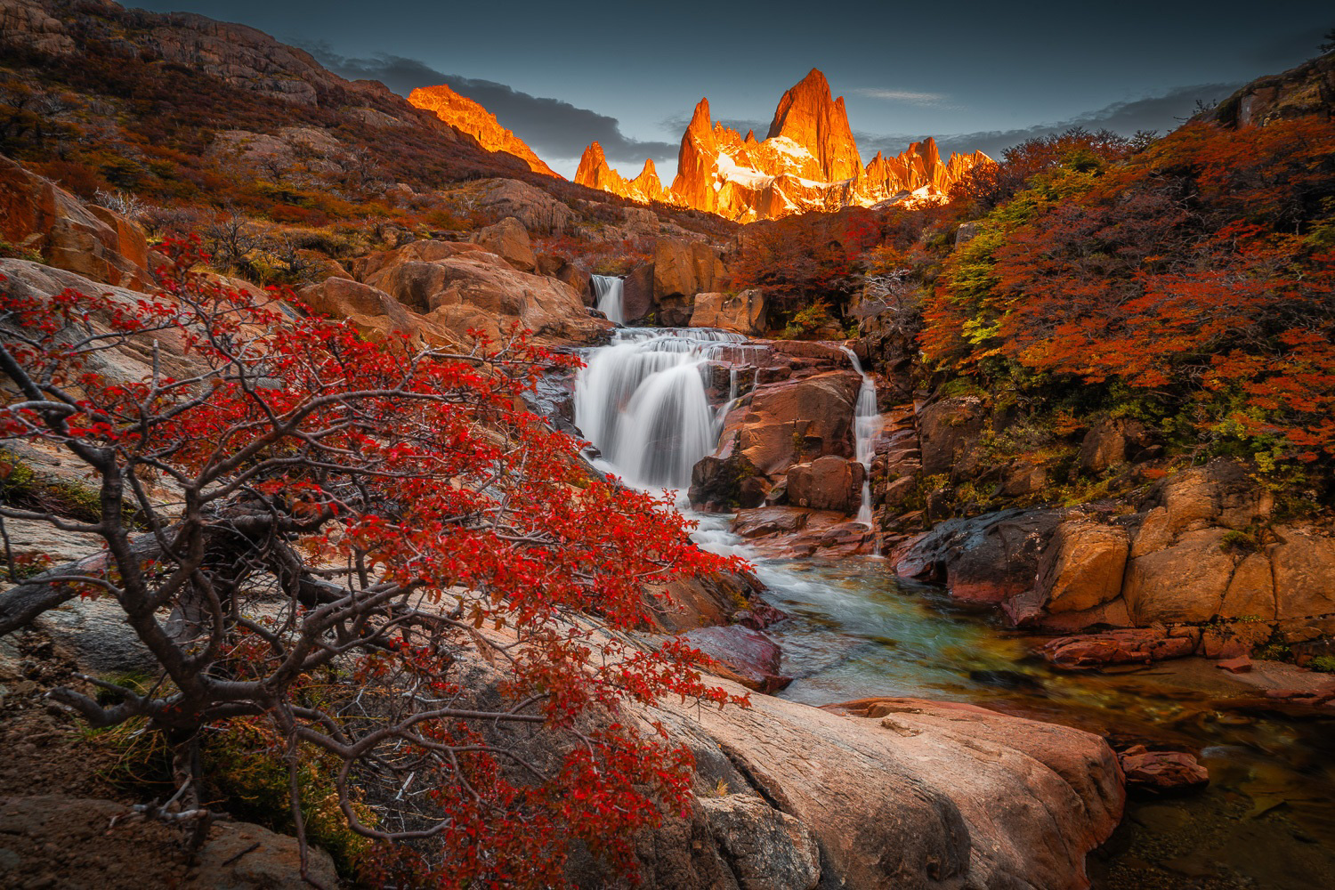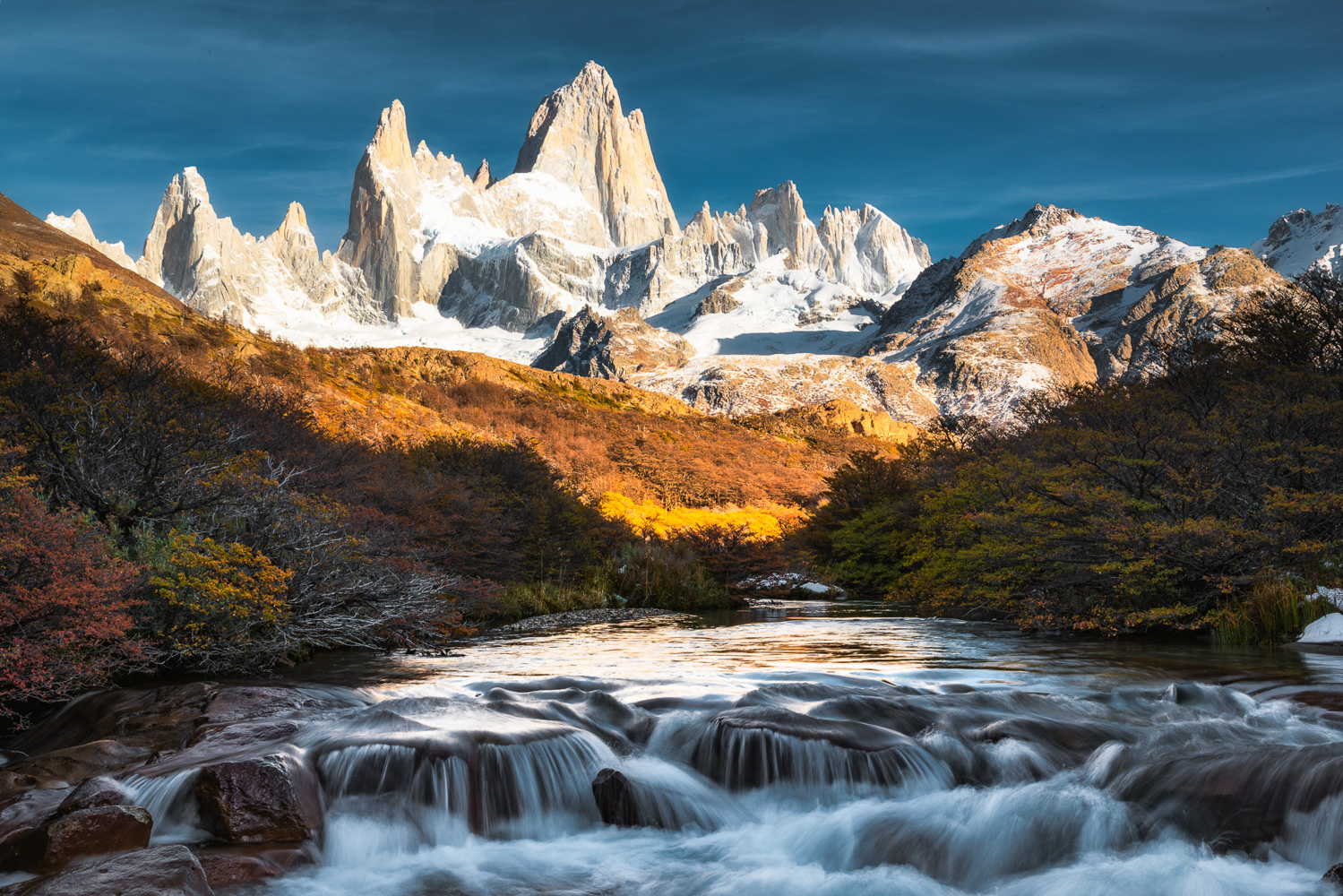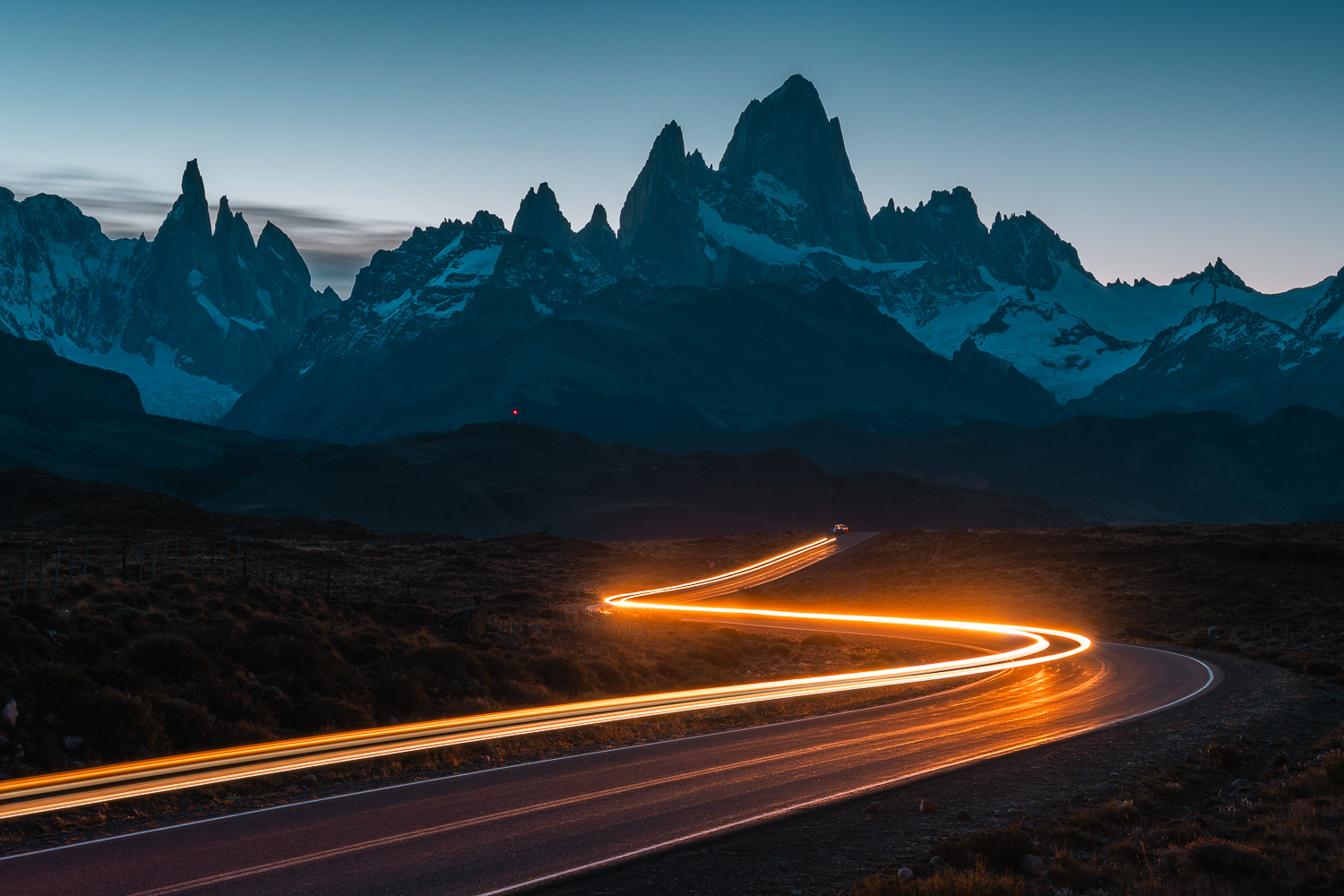 Die nächsten drei Tage werden wir die besten fotografischen Blickwinkel für die beiden markanten, unverwechselbaren Granittürme Fitz Roy und Cerro Torre, die weit in den patagonischen Himmel reichen, aufsuchen. Bereits in der unmittelbaren Umgebung von El Chaltén befinden sich einige tolle Perspektiven, die wir uns nicht entgehen lassen wollen. Unter anderem werden wir das bekannte Motiv – die kerzengerade Straße in Richtung El Chaltén mit dem atemberaubenden Bergpanorama im Hintergrund – fotografisch in Szene setzen. Um zu den spektakulärsten Aussichtspunkten am Fuße des Bergpanoramas zu gelangen, werden wir darüber hinaus sowohl zum Fitz Roy als auch zum Cerro Torre eine längere, abwechslungsreiche Wanderung unternehmen. Wir brechen beide Male bereits in der nächtlichen Dunkelheit auf, um im wunderschönen Morgenlicht fotografieren zu können. Die Strecken betragen ca. 20 Kilometer (jeweils 10 km hin und zurück). Da nur etwa 300 Höhenmeter zu überwinden sind, ist diese Wanderung mit einer moderaten Kondition gut zu schaffen. Wenn Sie die angeleuchteten, hellgrauen Berge bei aufgehender Sonne erleben und fotografieren, wird die nächtliche Anstrengung schnell vergessen sein. Sie dürfen sich nicht nur auf die beiden Granit-Riesen, sondern auch auf viele weitere Highlights auf unseren Touren rund um El Chaltén freuen. Unsere Wanderung am Fuße des Fitz Roy Massivs führt uns entlang des ungezähmten, sich schlängelnden Gebirgsflusses Las Vueltas. Immer wieder werden wir einen fotografischen Stopp einlegen und das imposante Panorama festhalten. Auf unserem Weg bestaunen wir den 20 Meter hohen Chorillo del Salto Wasserfall in seiner einzigartigen Schönheit und halten ihn mit fließenden Langzeitbelichtungen für die Ewigkeit fest. Und nicht nur das: unser Fotograf hält einen echten Geheimtipp für einen weiteren, gut versteckten Wasserfall für Sie bereit!