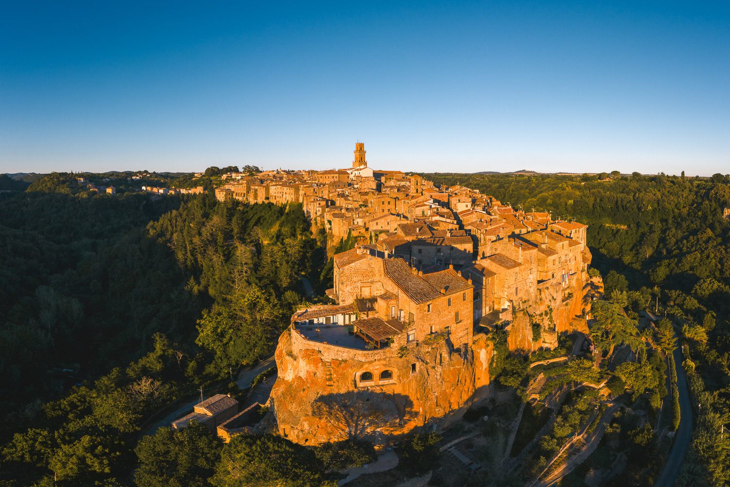 Noch ein letztes Shooting zum Sonnenaufgang, dann ist es schon an der Zeit, das Val d'Orcia zu verlassen und in Richtung Süden zu den antiken Tuffsteinstädten Pitigliano und Sorano aufzubrechen. Pitigliano präsentiert sich inmitten eines märchenhaften Panoramas - ein magischer Anblick der uns noch lange im Gedächtnis bleiben wird. In 300 Metern Höhe erhebt sich die Silhouette des Städtchens über einem steilen Tuffsteinplateau, begrenzt von üppig grünen Tälern und Flüssen. Zahllose würfelförmige Häuser schmiegen sich unterhalb einer Kathedrale dicht aneinander und wirken selbst wie aus bizarrem Fels gehauen. Die hohen Tuffsteinwände, die von Tausenden von Höhlen und Wohntürmen durchbrochen werden, prägen die mittelalterliche Stadtanlage, welche mit ihren steil abfallenden Hängen wie aus dem Boden der Maremma gewachsen zu sein scheint. Unsere Fahrt gleicht einer Zeitreise: vor uns liegt nun Sorano, eine alte Stadt, die ihre Blüte während der Etruskerzeit erlebte. Sie ist von pittoresken Häusern und Gassen in einer unvergleichlichen Atmosphäre geprägt. Auch Sorano liegt, wie das nahe Pitigliano, auf einem Tuffsteinfelsen und wird ‘Matera der Toskana’ genannt. Ein Name, der auf Höhlenwohnungen und die faszinierenden Via delle Cave, in den Fels geschlagene Hohlwege, zurückzuführen ist.